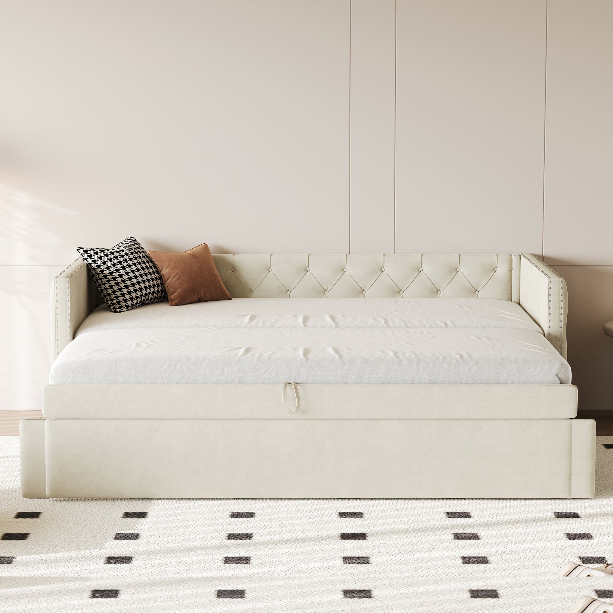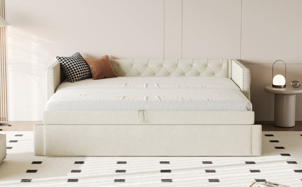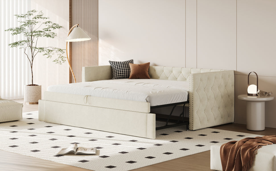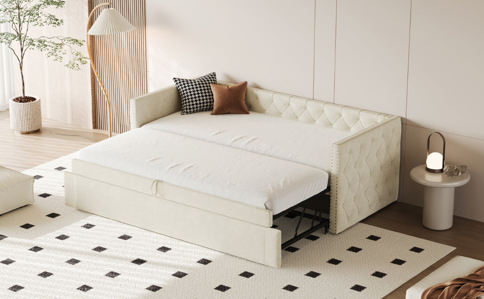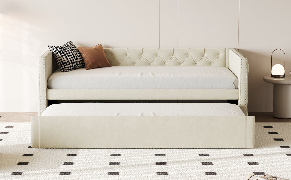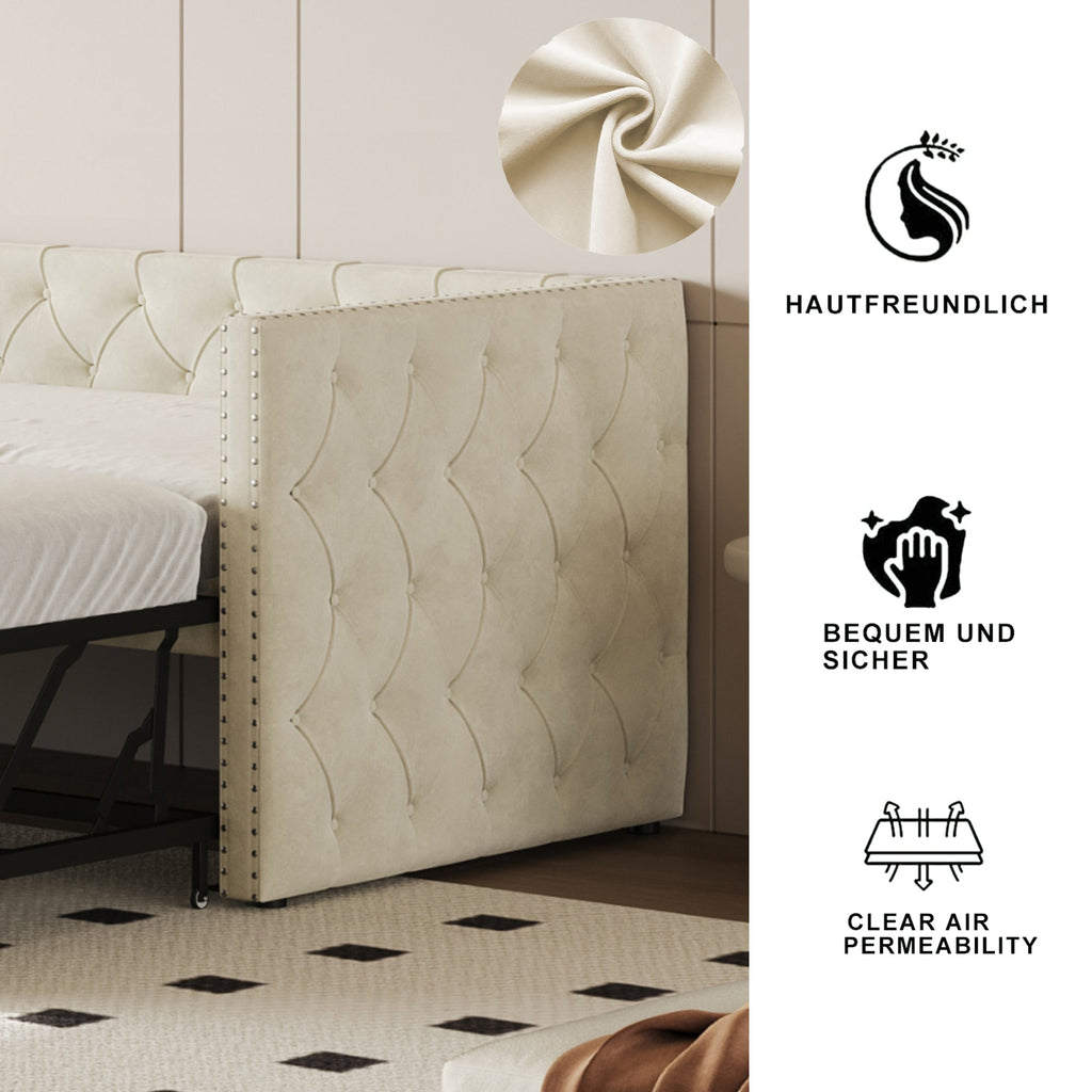 Upholstered Bed, 90x200cm Pull-out Sofa Guest Bed with Slatted Frame, Beige Velvet