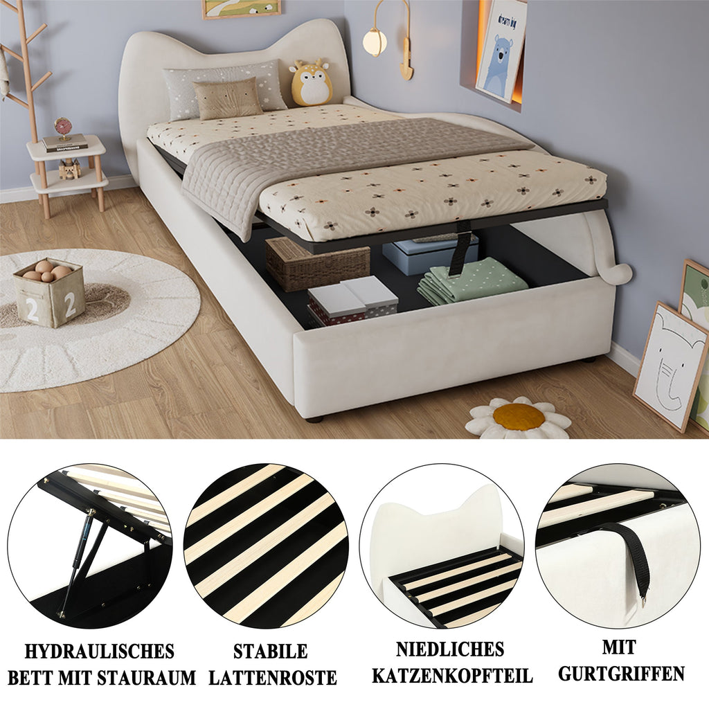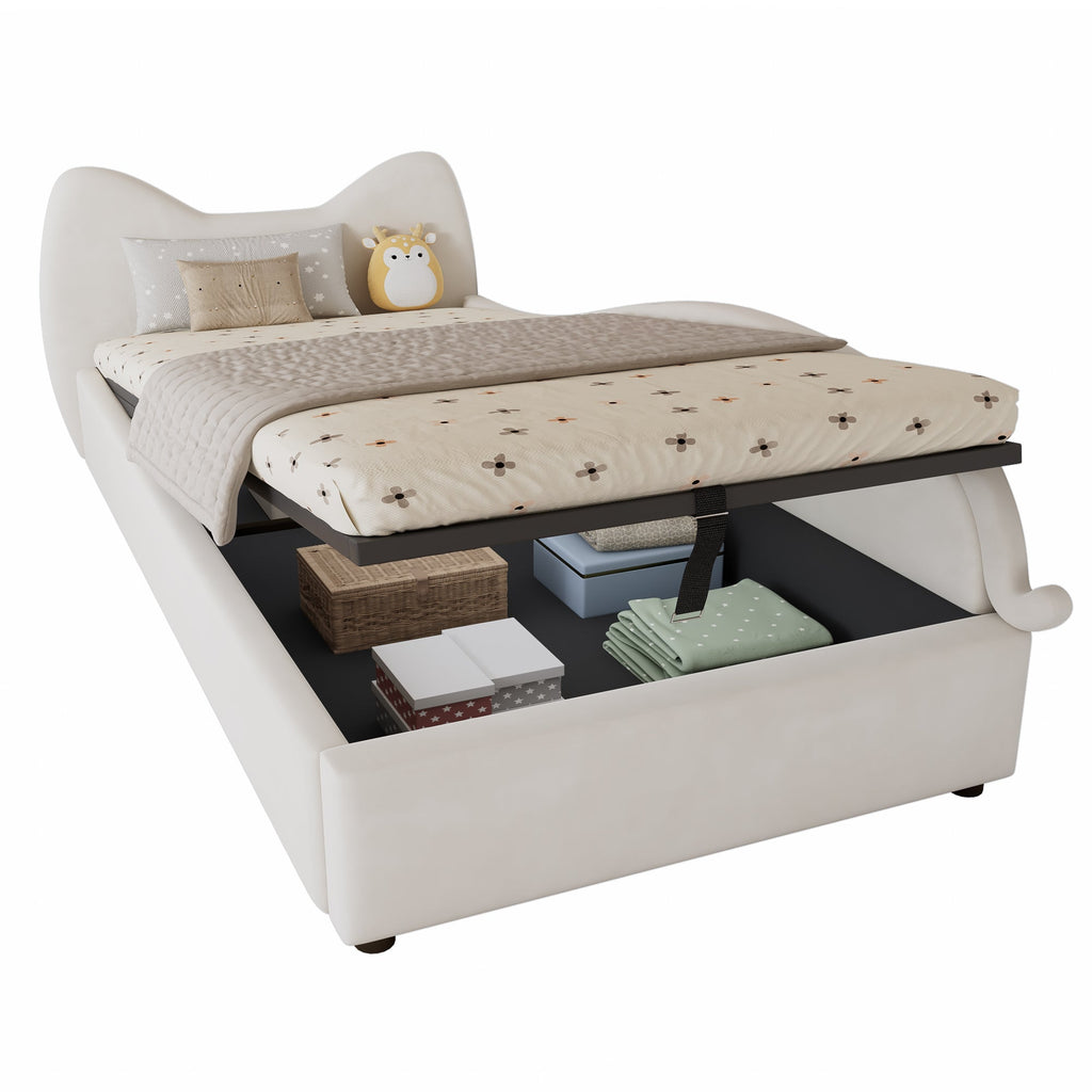 Upholstered Bed, Single Bed, Children's Bed, Cute Cat Design, Velvet, Beige, Right Side Panel