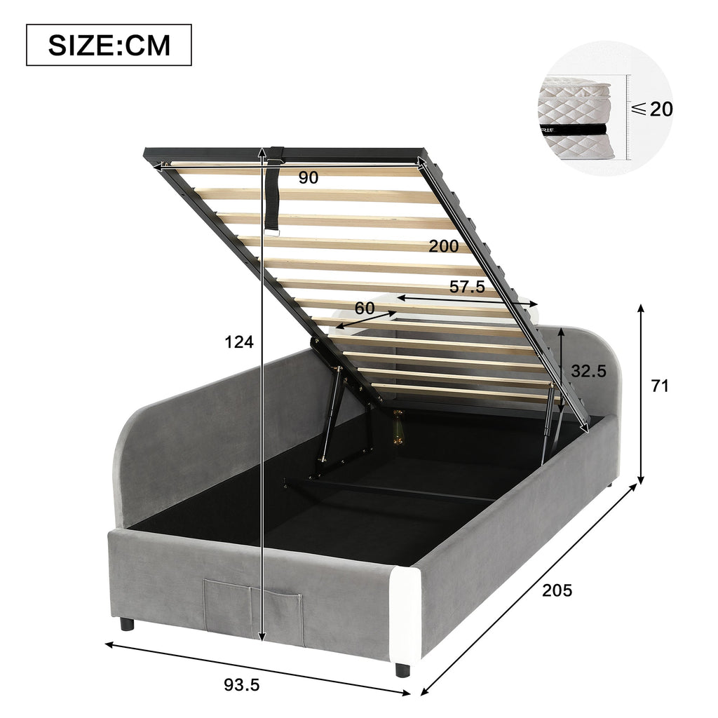 Upholstered Bed, Combined Children's Hydraulic with Storage, Grey Velvet & Plywood