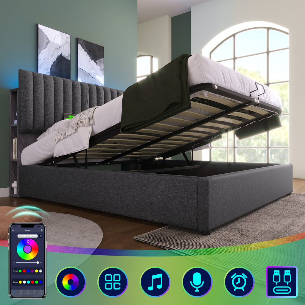 Upholstered Bed, Double, LED App-Control, USB-C Charging, Storage, Adjustable Headboard, Wood, Gray