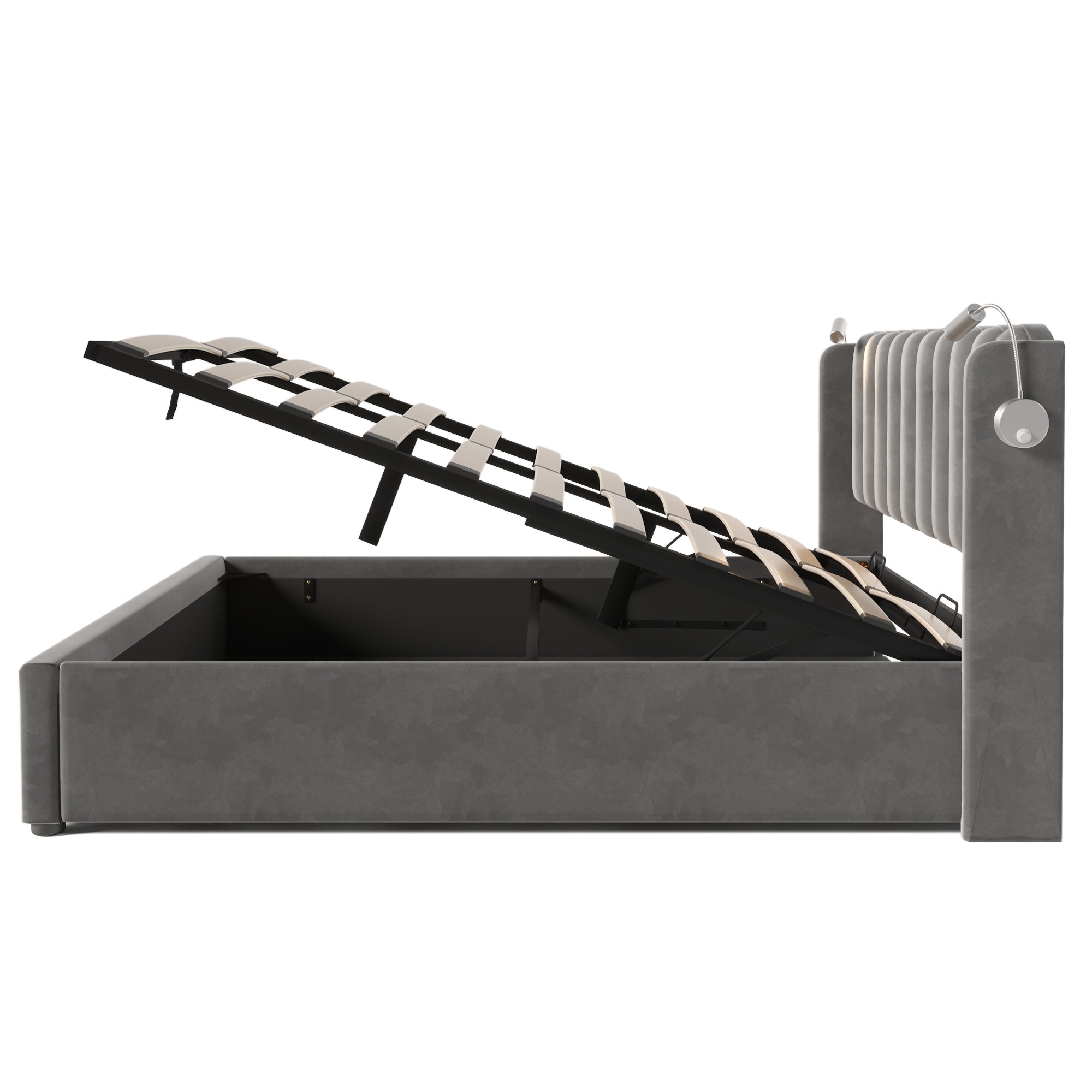 Upholstered Bed, Double with Reading Light, Charging, Storage, 160x200 Velvet Gray