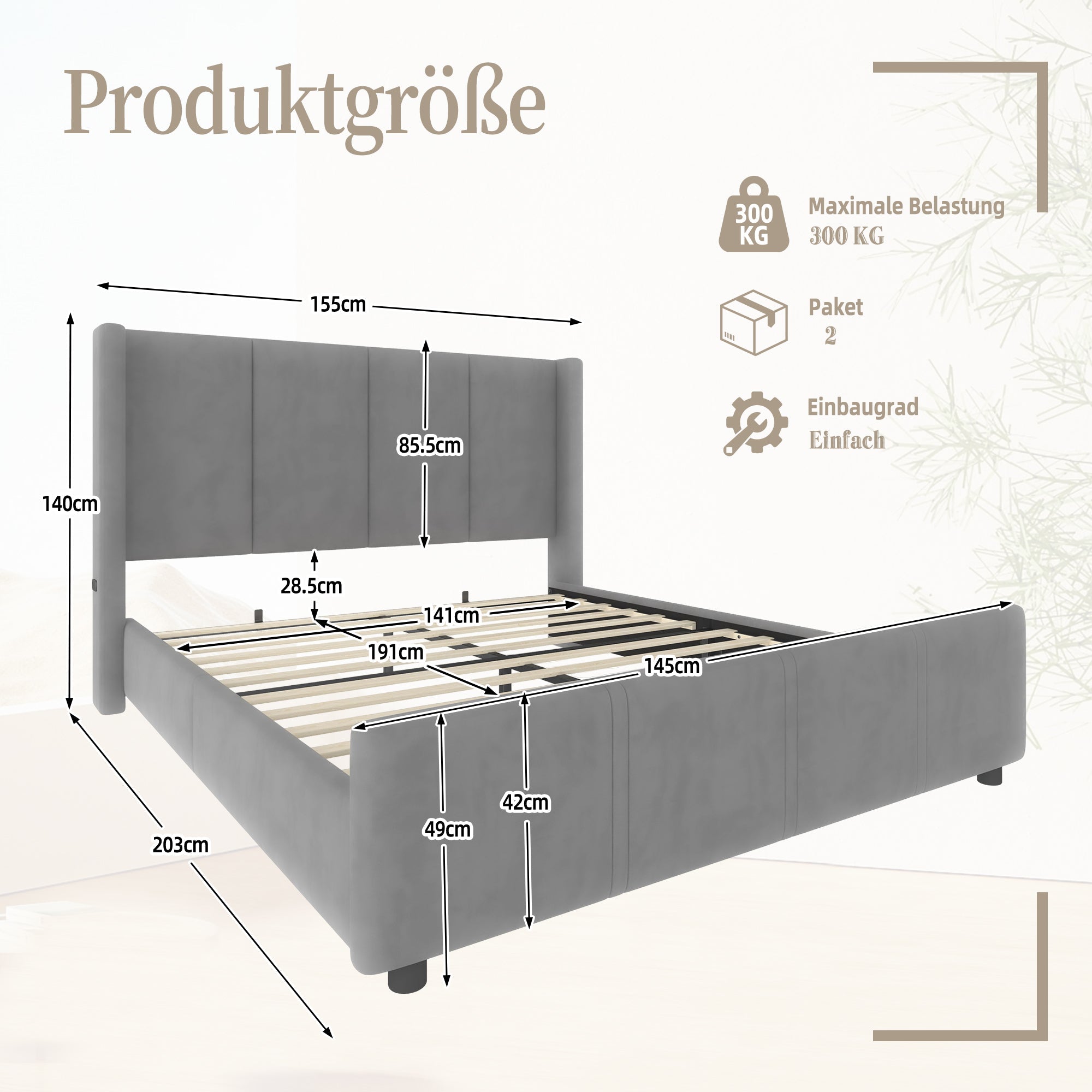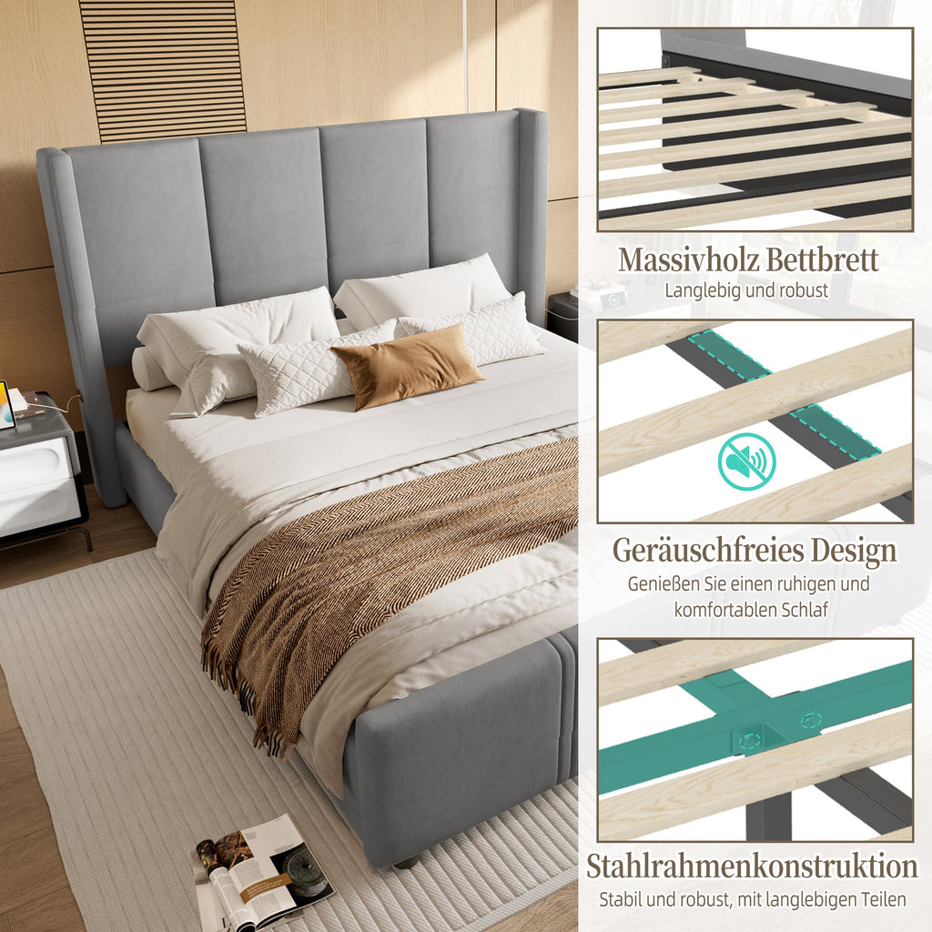 Upholstered Bed Frame, 140x190cm High Headboard & Footboard with USB Port, Grey