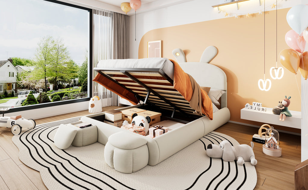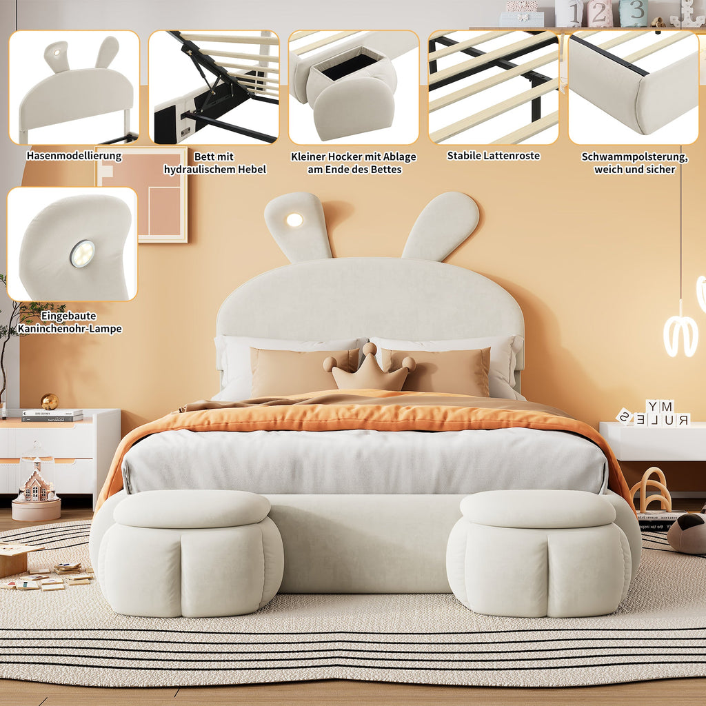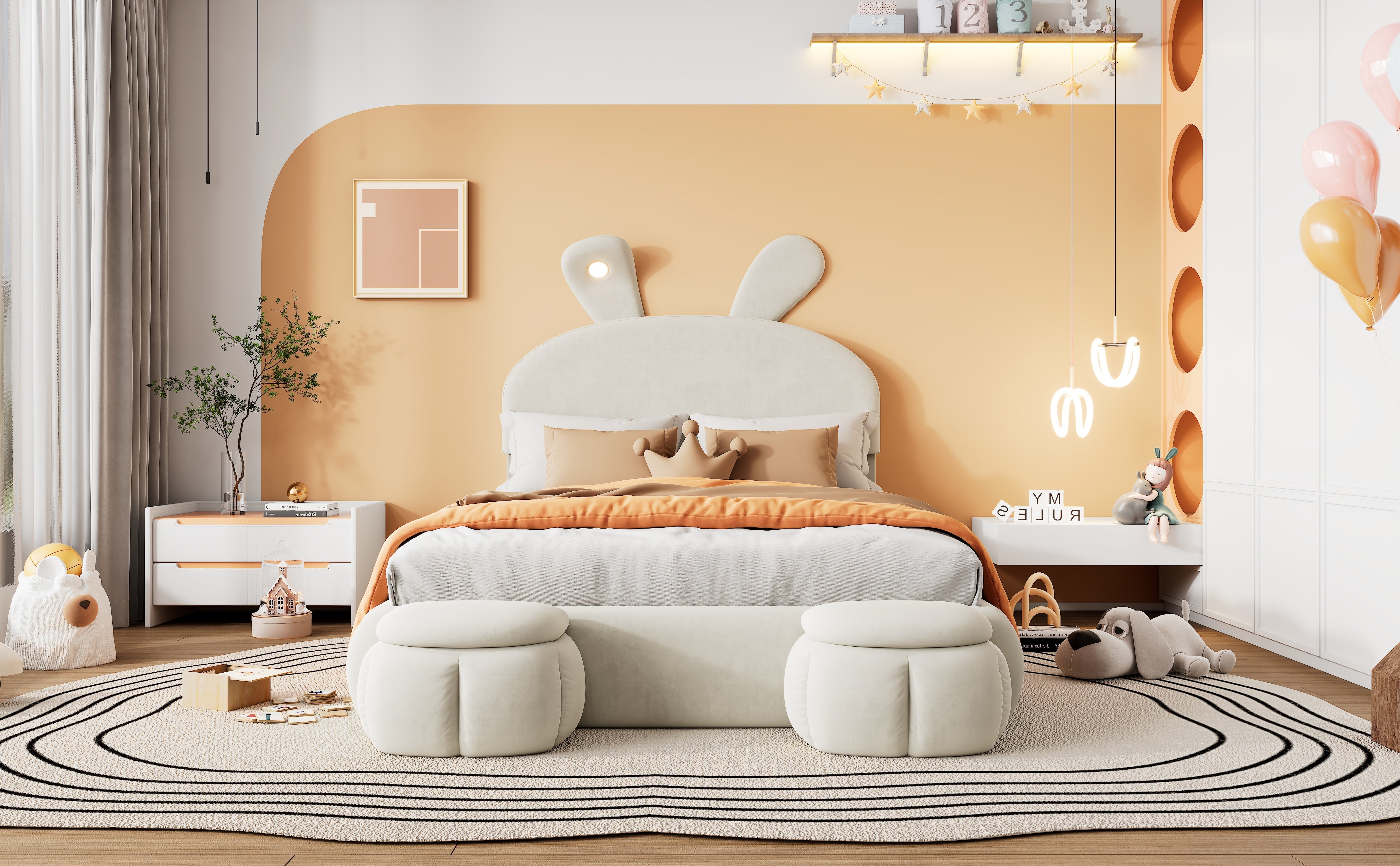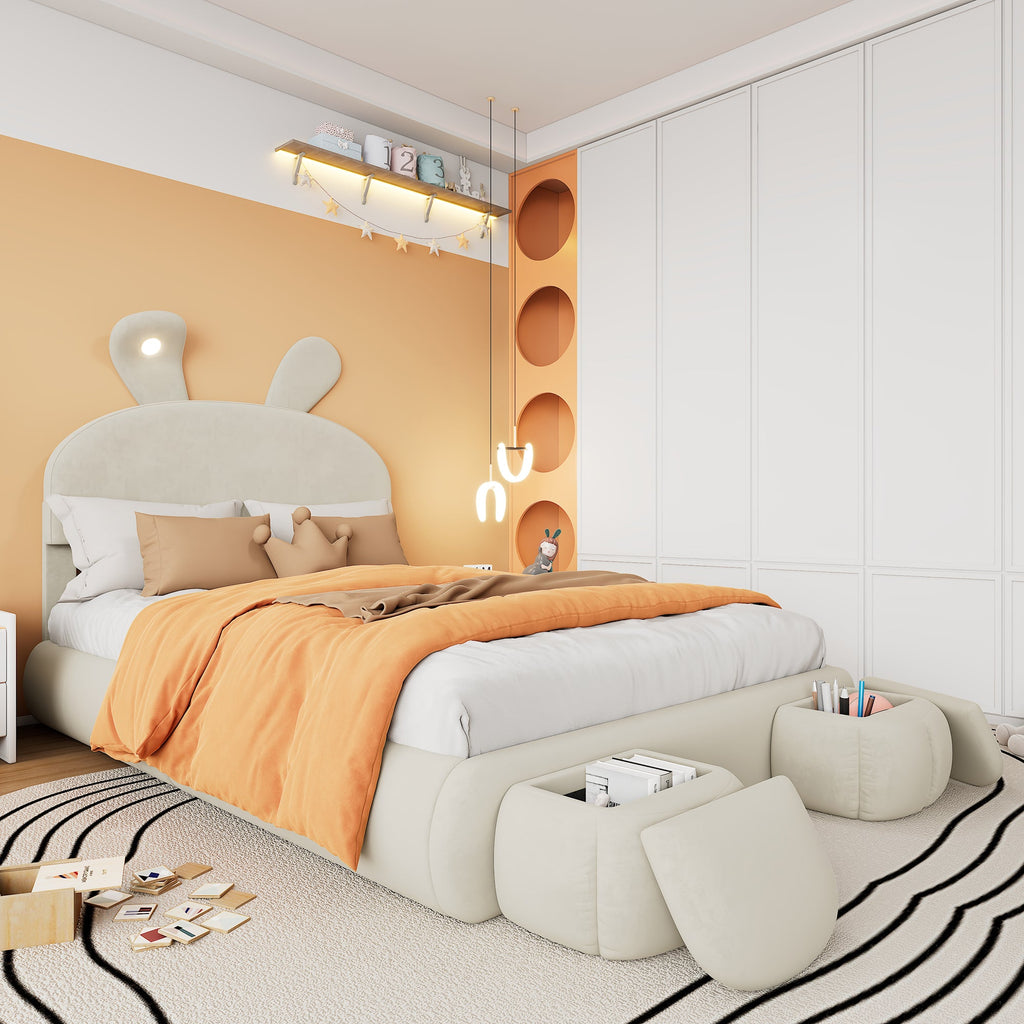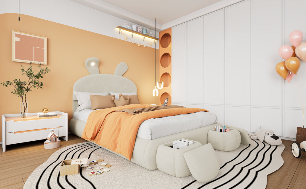 Accompanying the bed are two round, cartoon-style storage ottomans that can be placed flexibly at the end of the bed or anywhere else in the room. One of the bunny ears features an LED light with adjustable brightness, emitting a warm yellow glow.