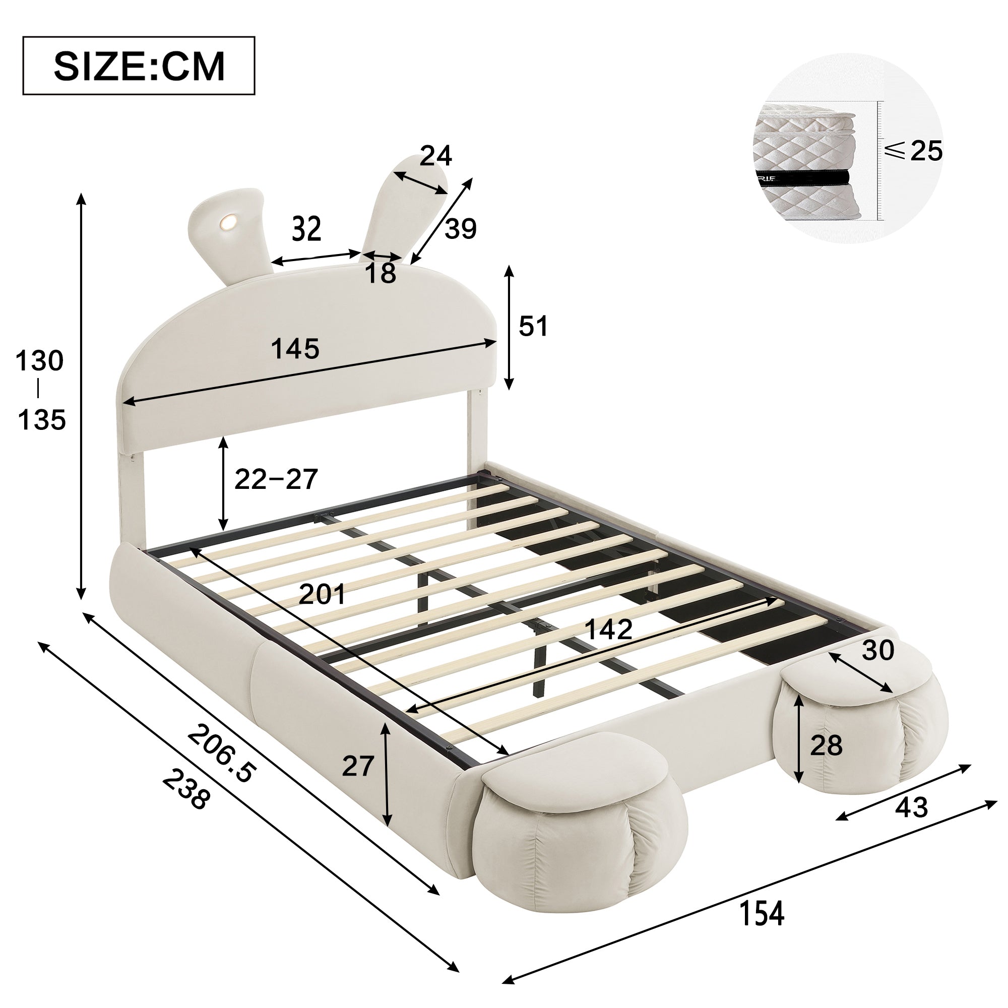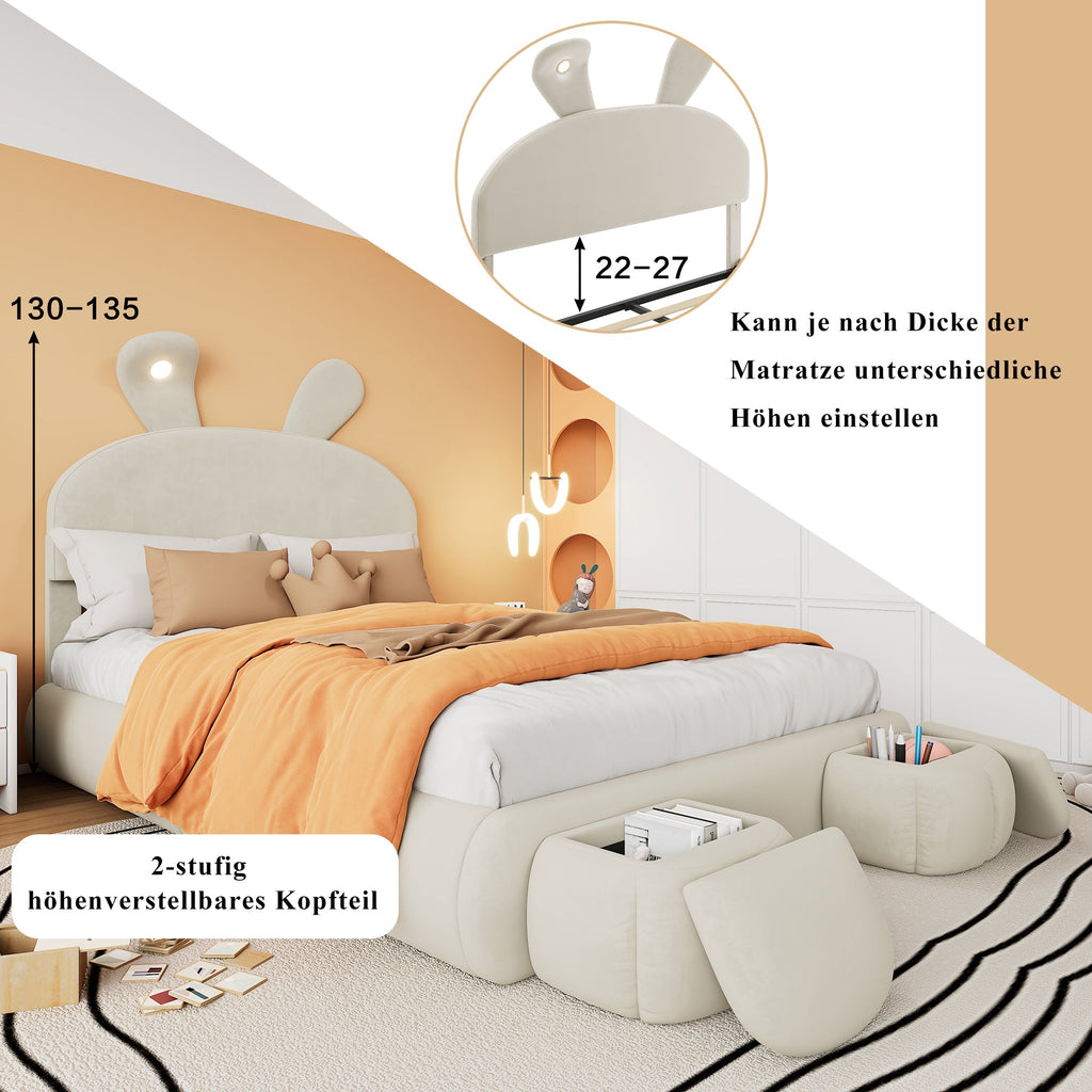 This soft bed, designed with charming bunny ears and upholstered in luxurious beige velvet, offers a unique design and practical functionality. It is suitable for a mattress size of 140x200cm, with a recommended mattress thickness of 25cm.