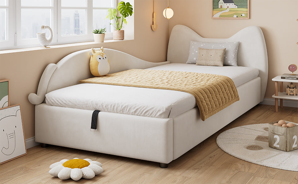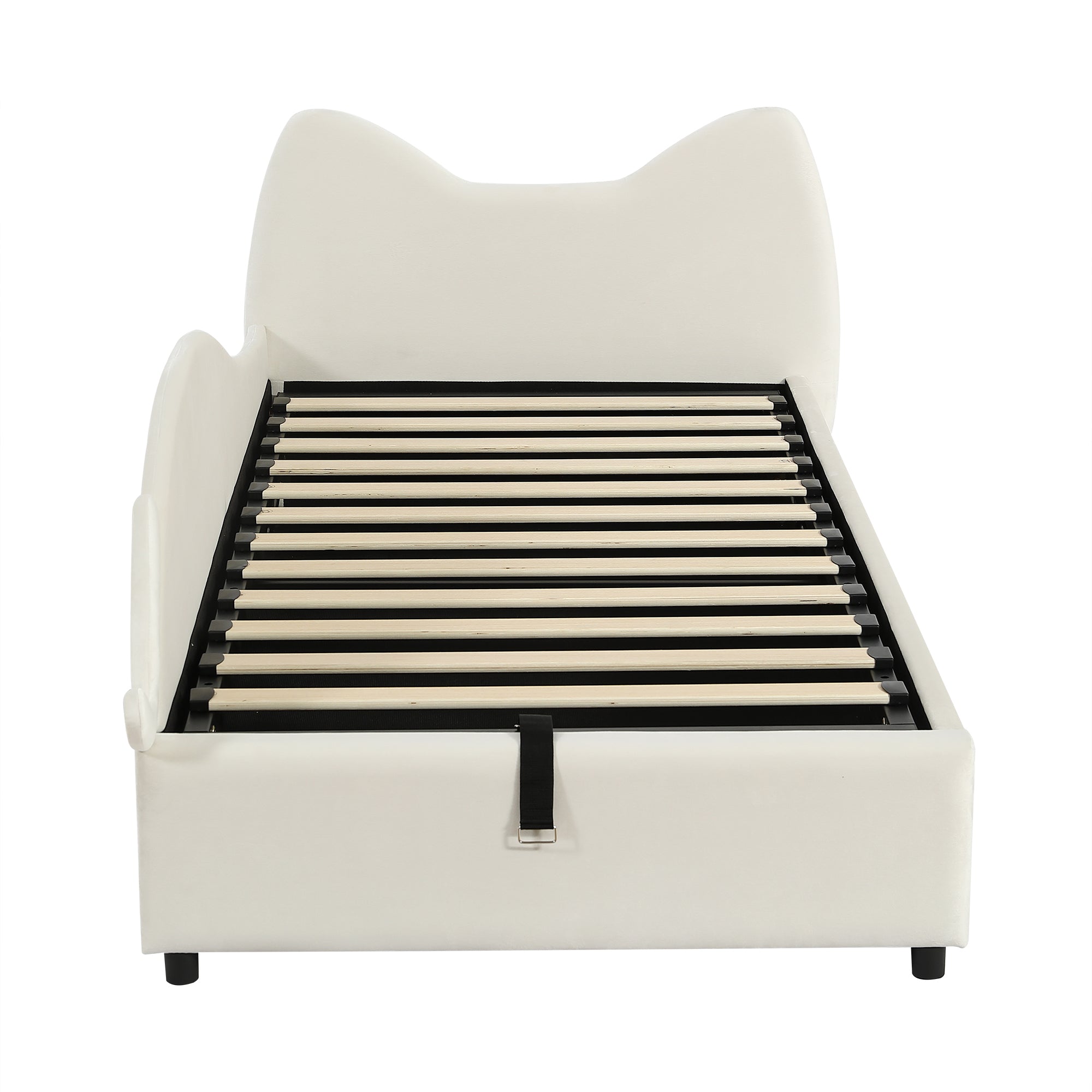 Upholstered Bed, Hydraulic with Storage, Cat Design, Velvet Beige