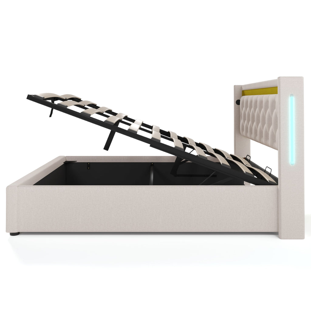 Upholstered Bed, LED Double Bed with USB & Type C Charging, Cotton