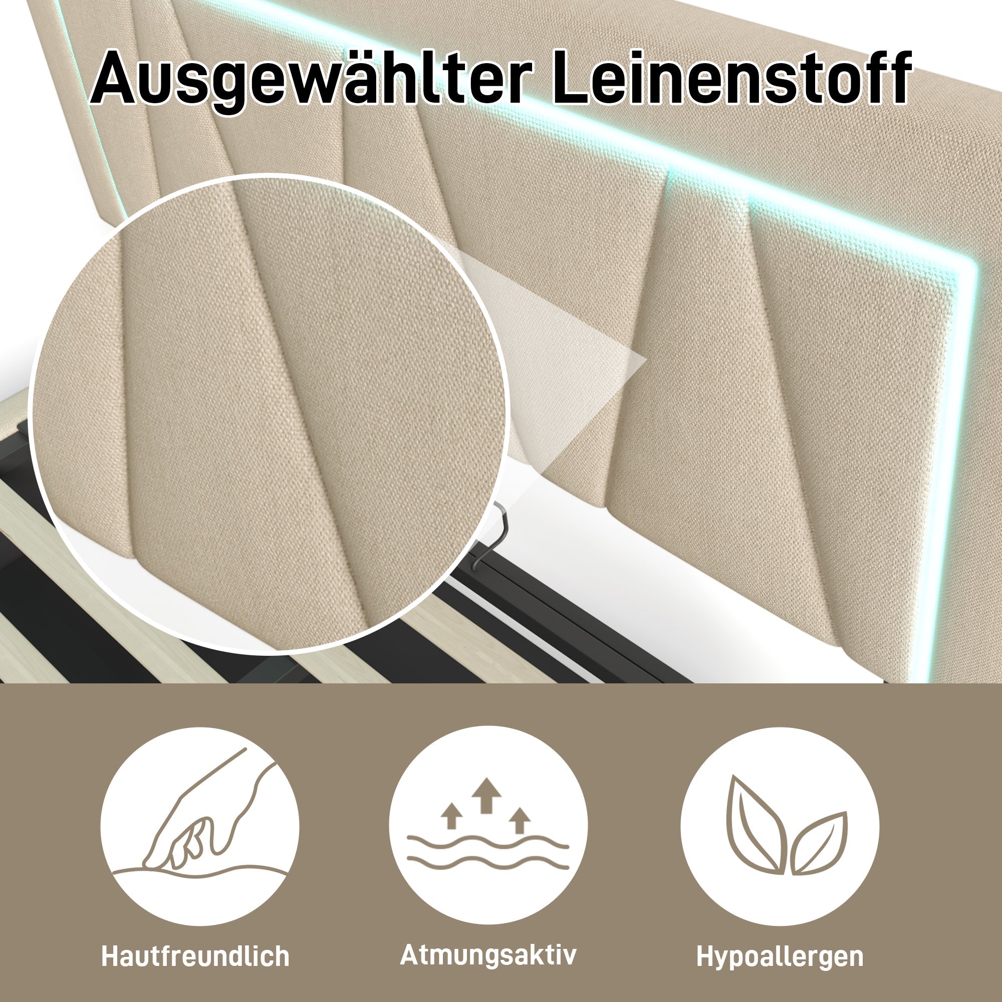 Upholstered Bed, LED Double with USB & Type C Charging, Linen