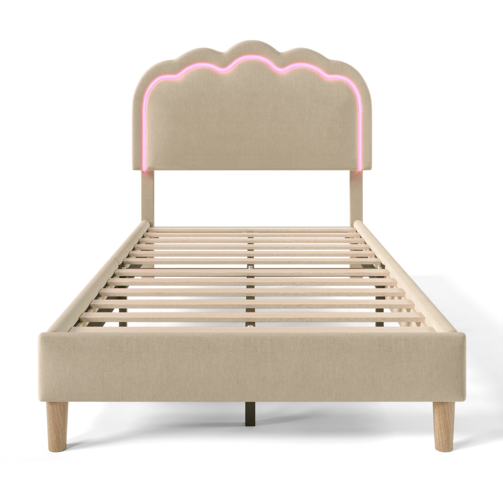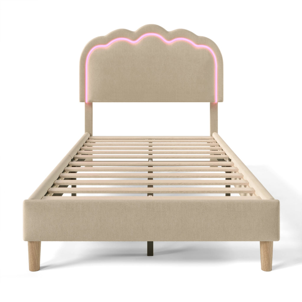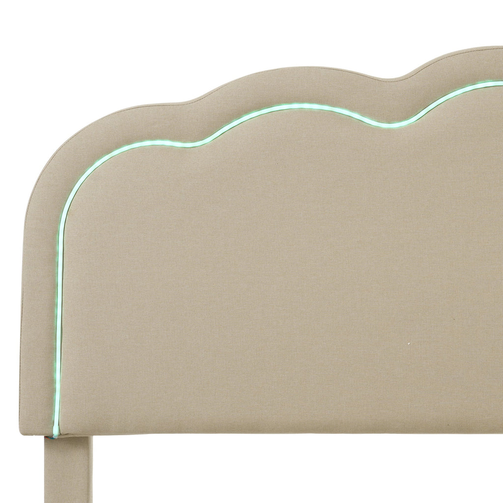 Upholstered Bed LED Single 90 x 190 cm with Adjustable Headboard, Beige Linen