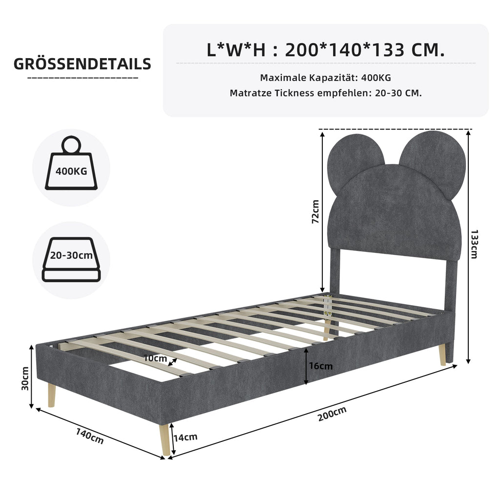 Upholstered Bed, Modern Minimalist, Cartoon-Design Headboard, 140x200 cm, Grey