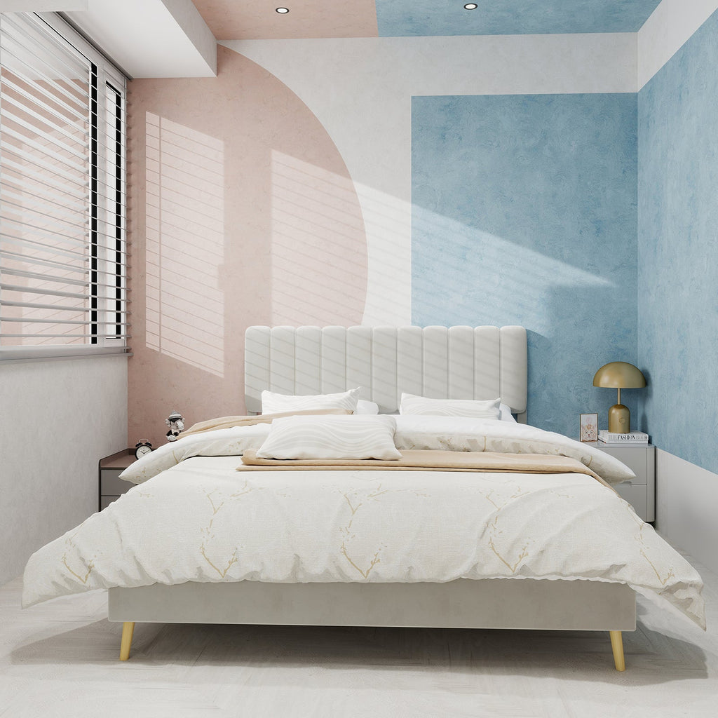 Upholstered Bed, Modern Minimalist Plush Headboard, 160x200cm, Beige