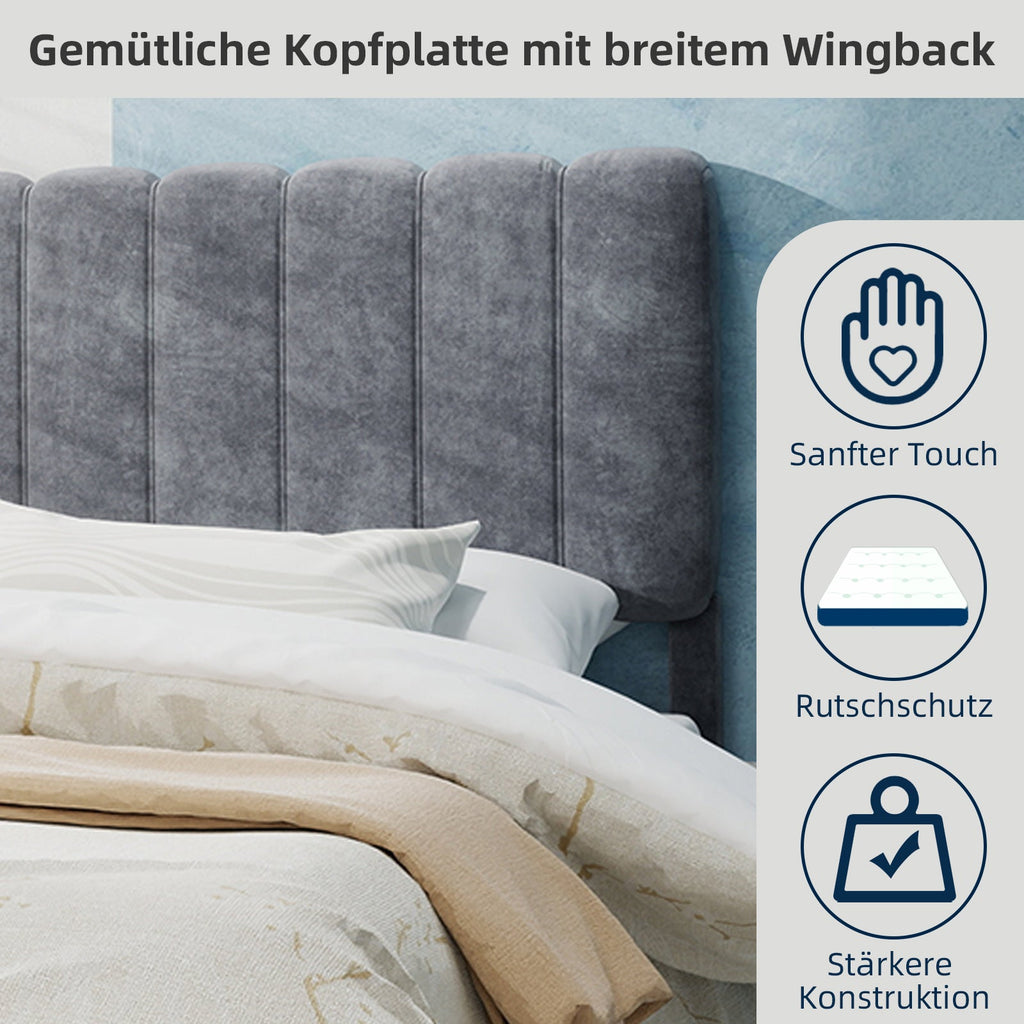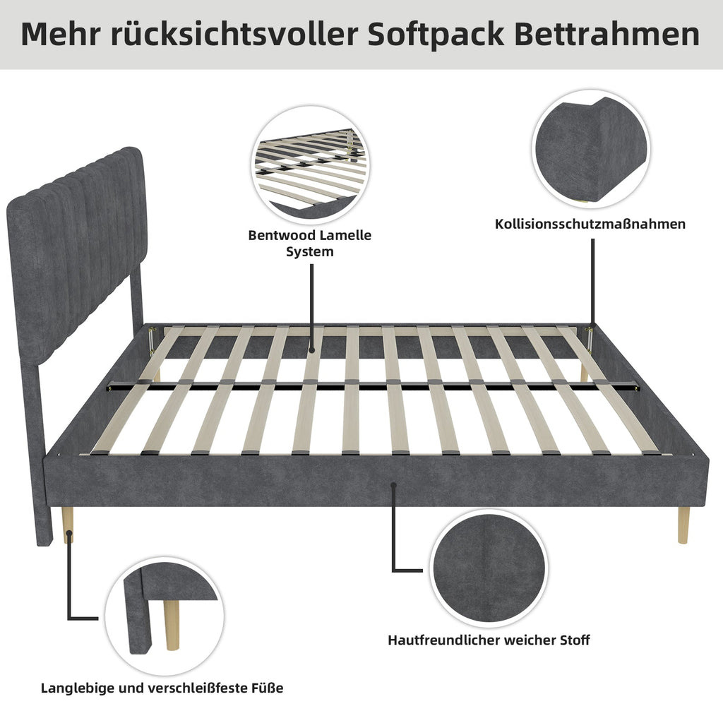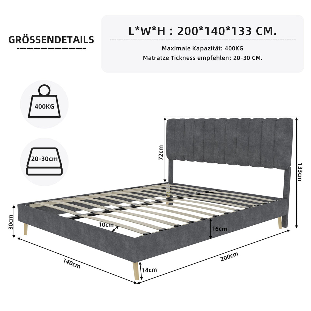 Upholstered Bed, Modern Minimalist Soft Headboard, 140x200cm Grey