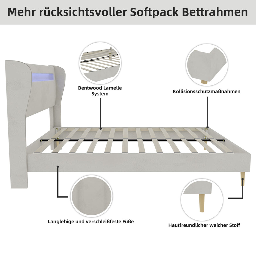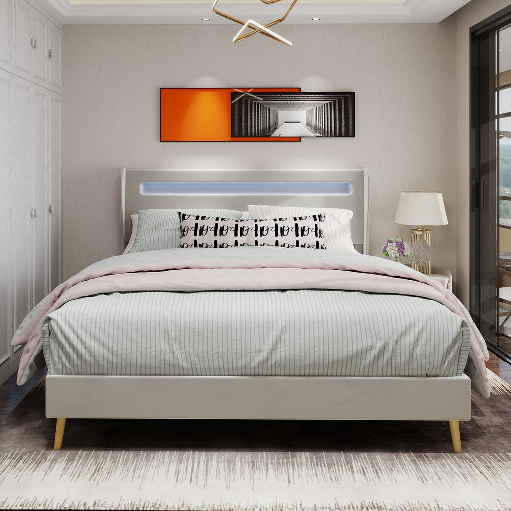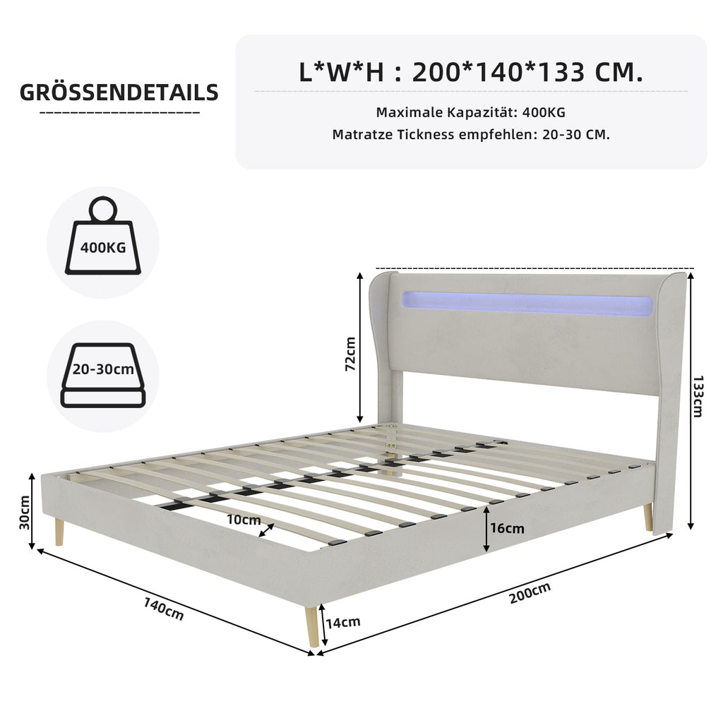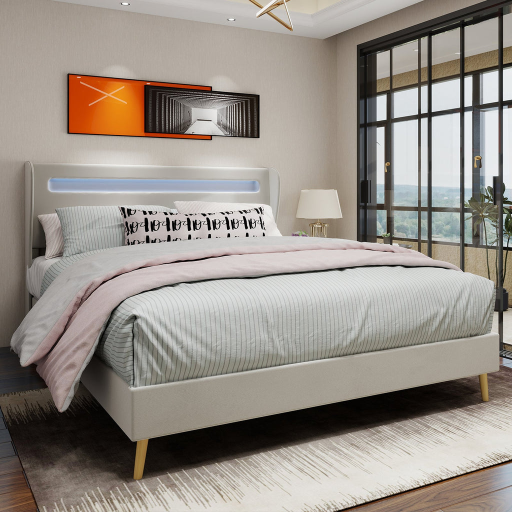 Upholstered Bed, Modern Minimalist with LED Headboard, 140x200 cm, Beige