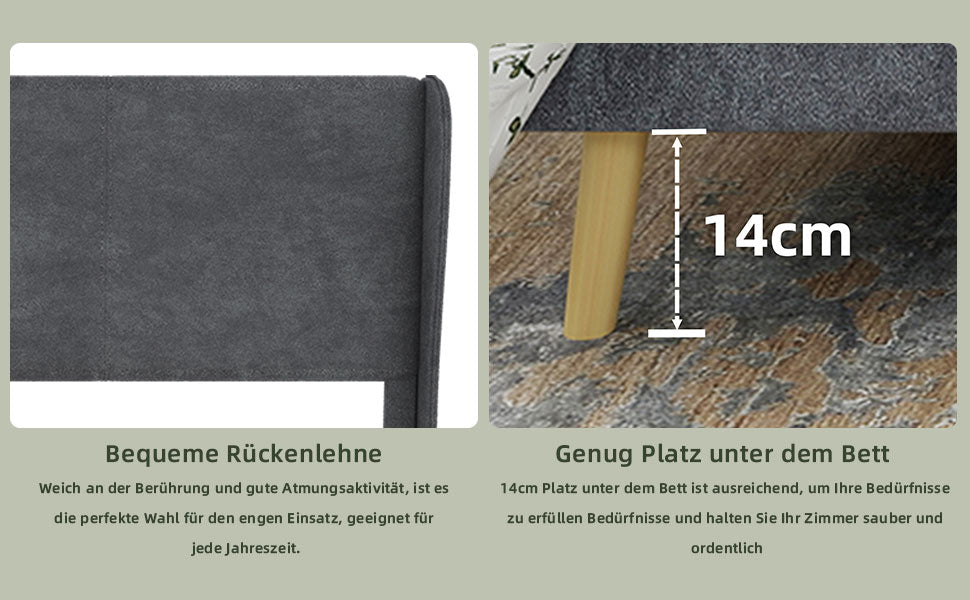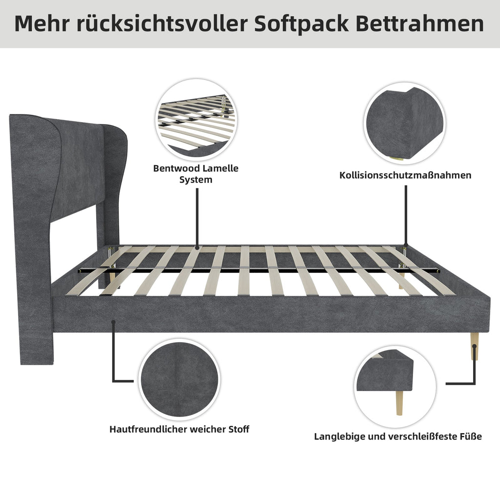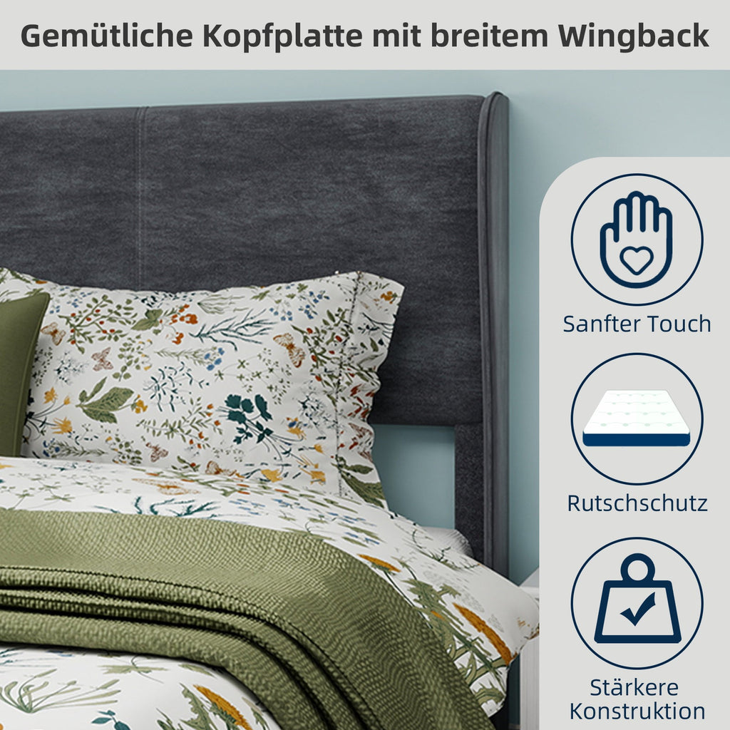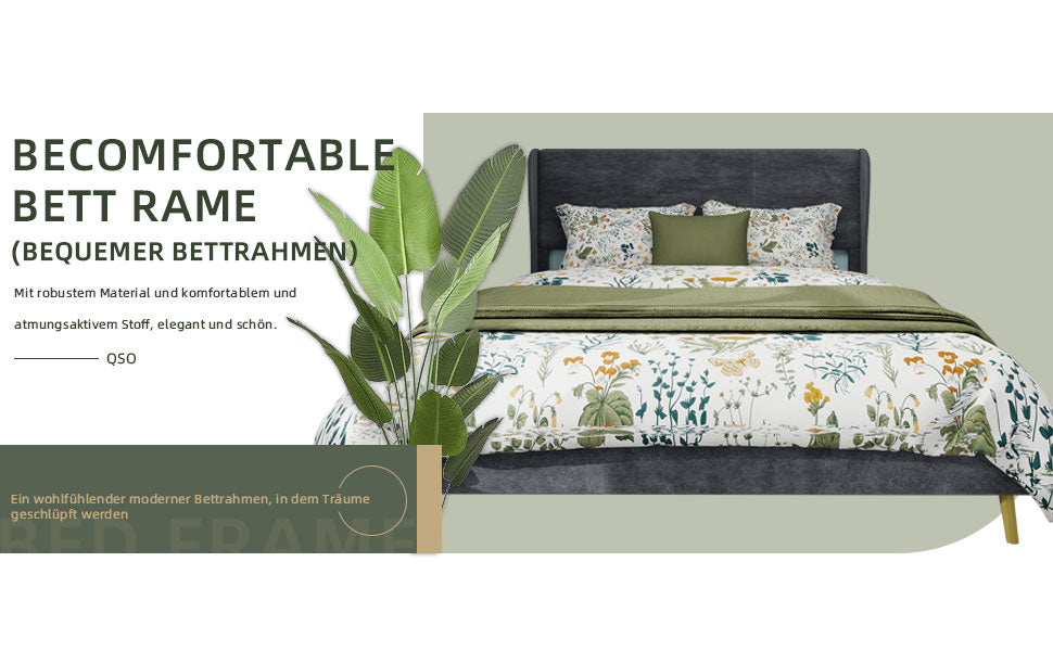 Modern Design: This bed frame showcases a modern, sophisticated style with a beautiful gray Dutch velvet upholstered headboard and backrest, perfectly complementing a variety of decor themes.