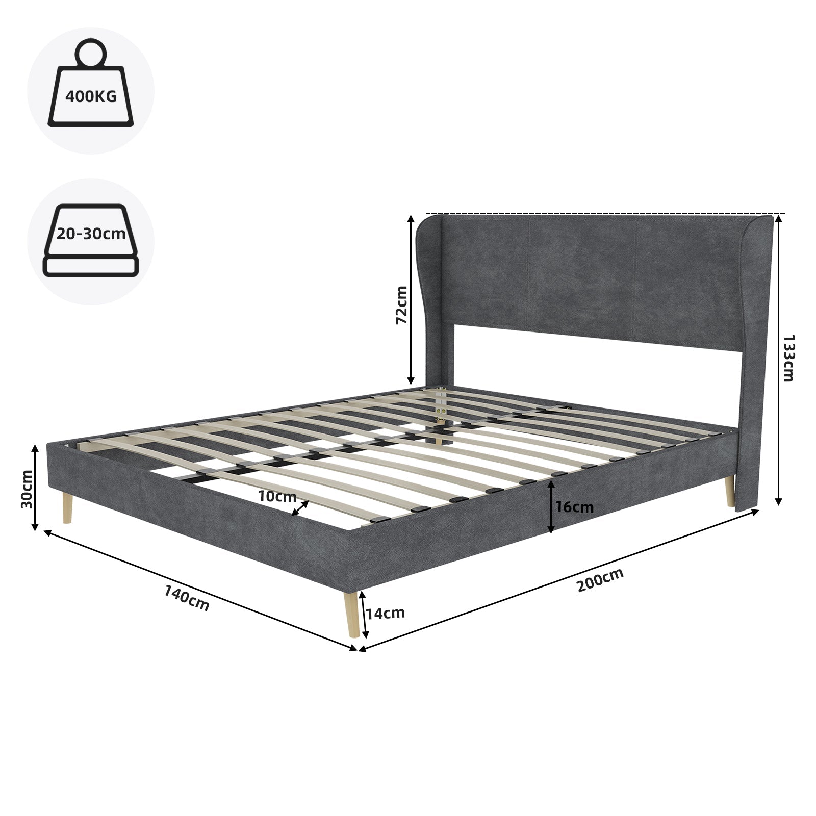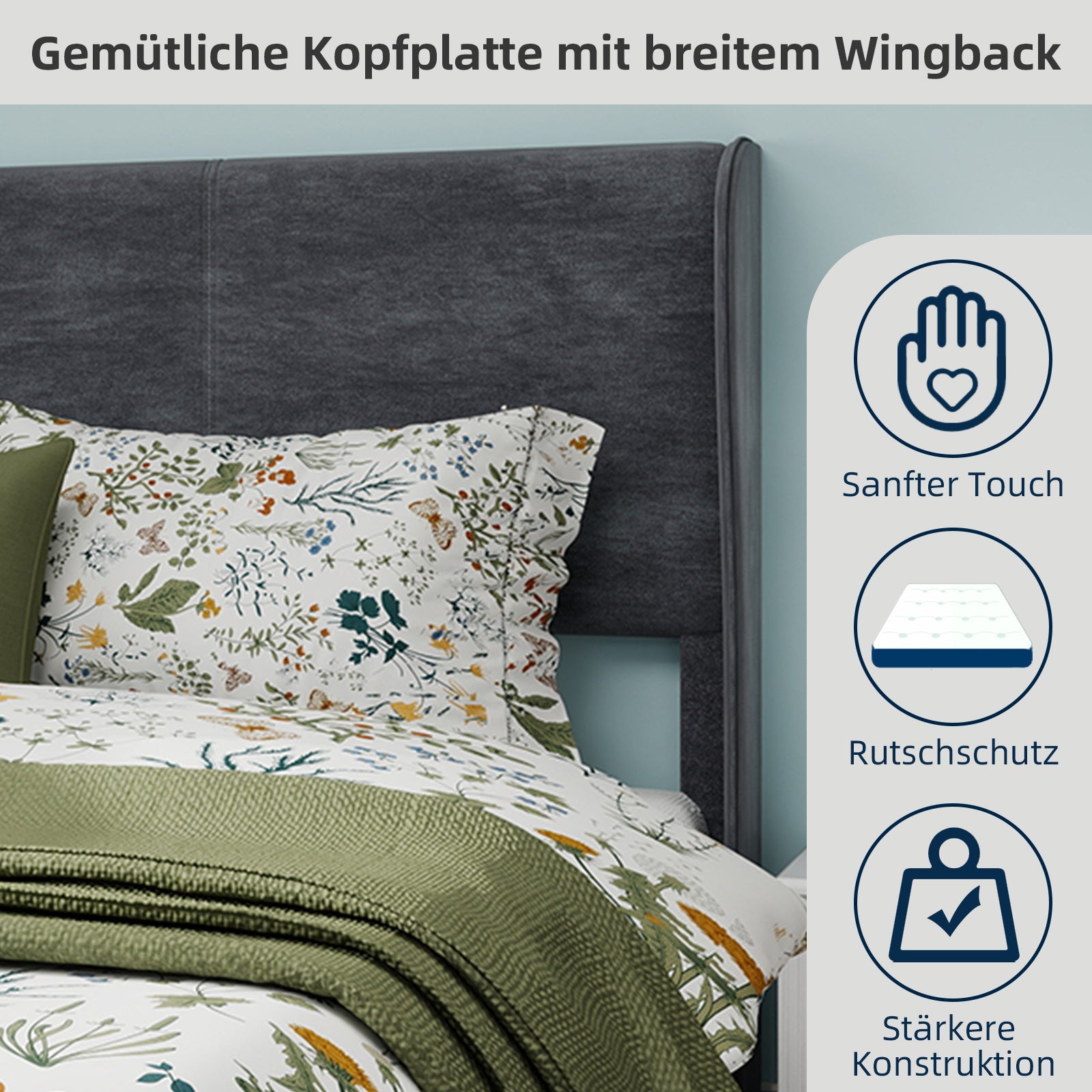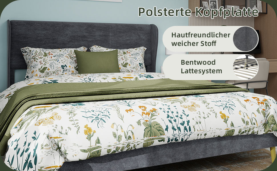 Modern Design: This bed frame showcases a modern, sophisticated style with a beautiful gray Dutch velvet upholstered headboard and backrest, perfectly complementing a variety of decor themes.