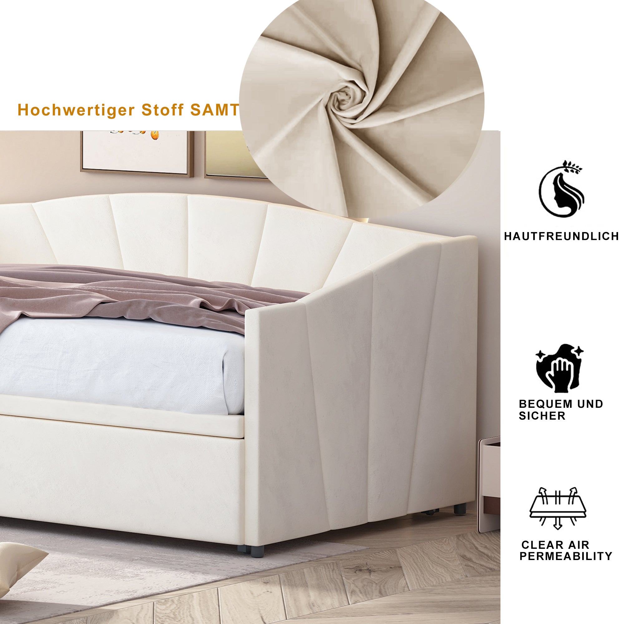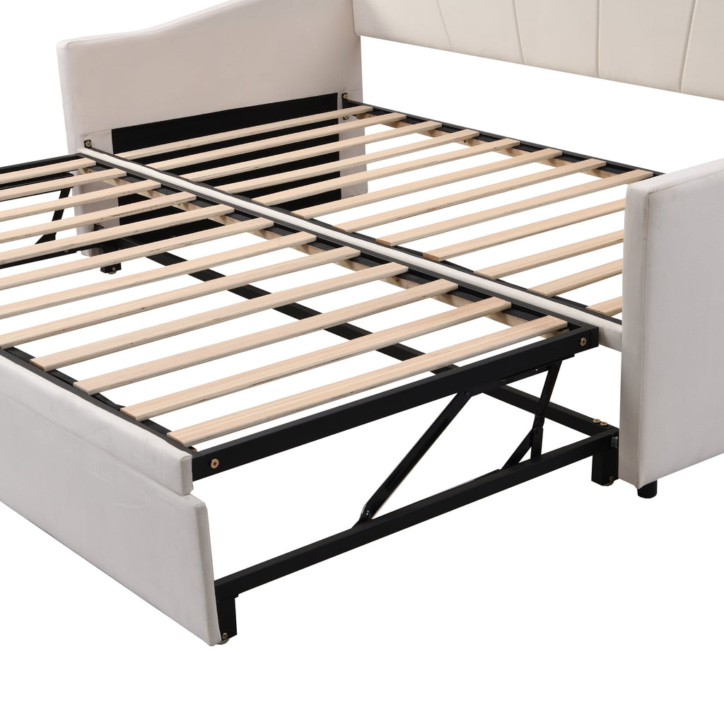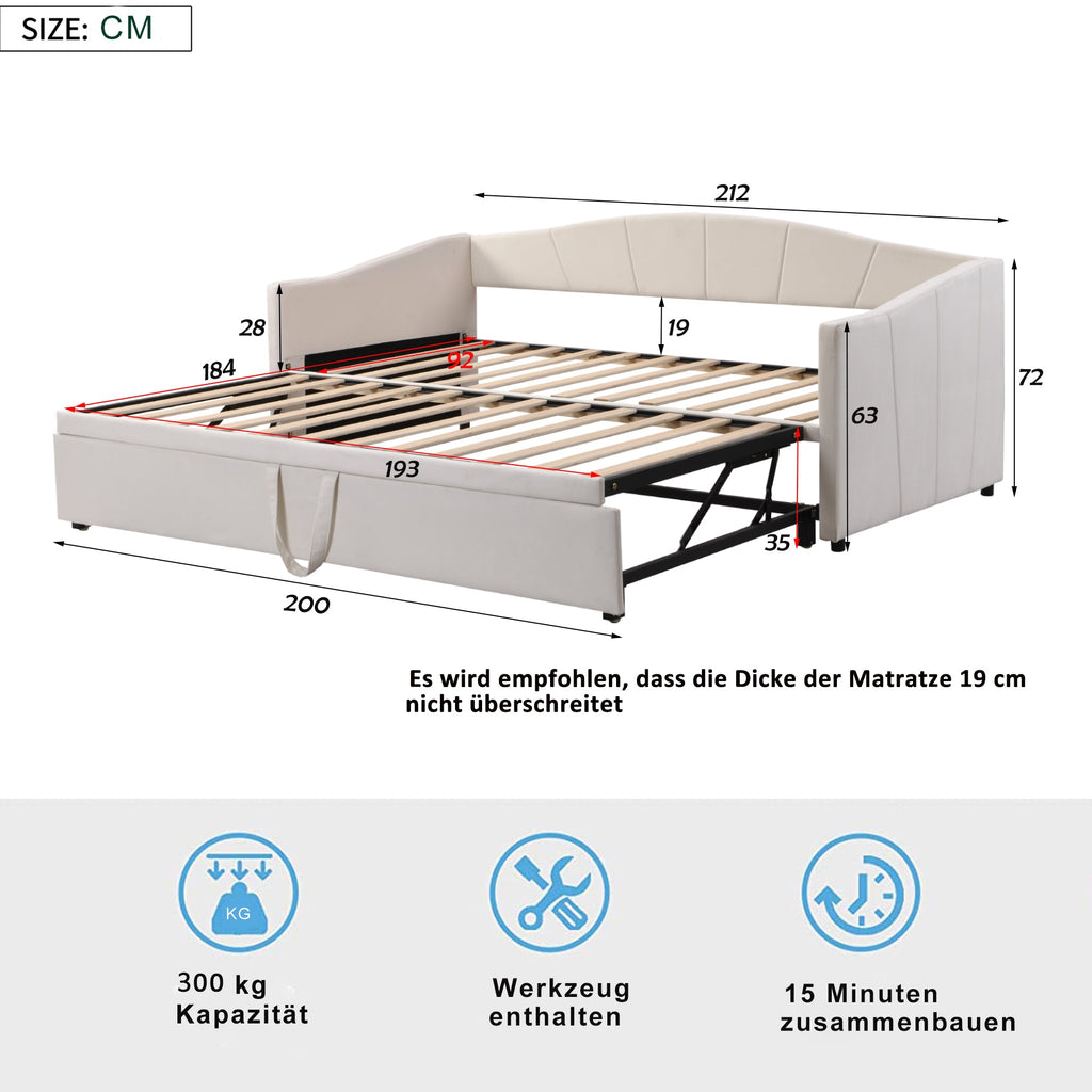 Upholstered Bed, Pull-out Sofa Bed 90/180*200 cm, Slatted Frames, Velvet Fabric, Beige