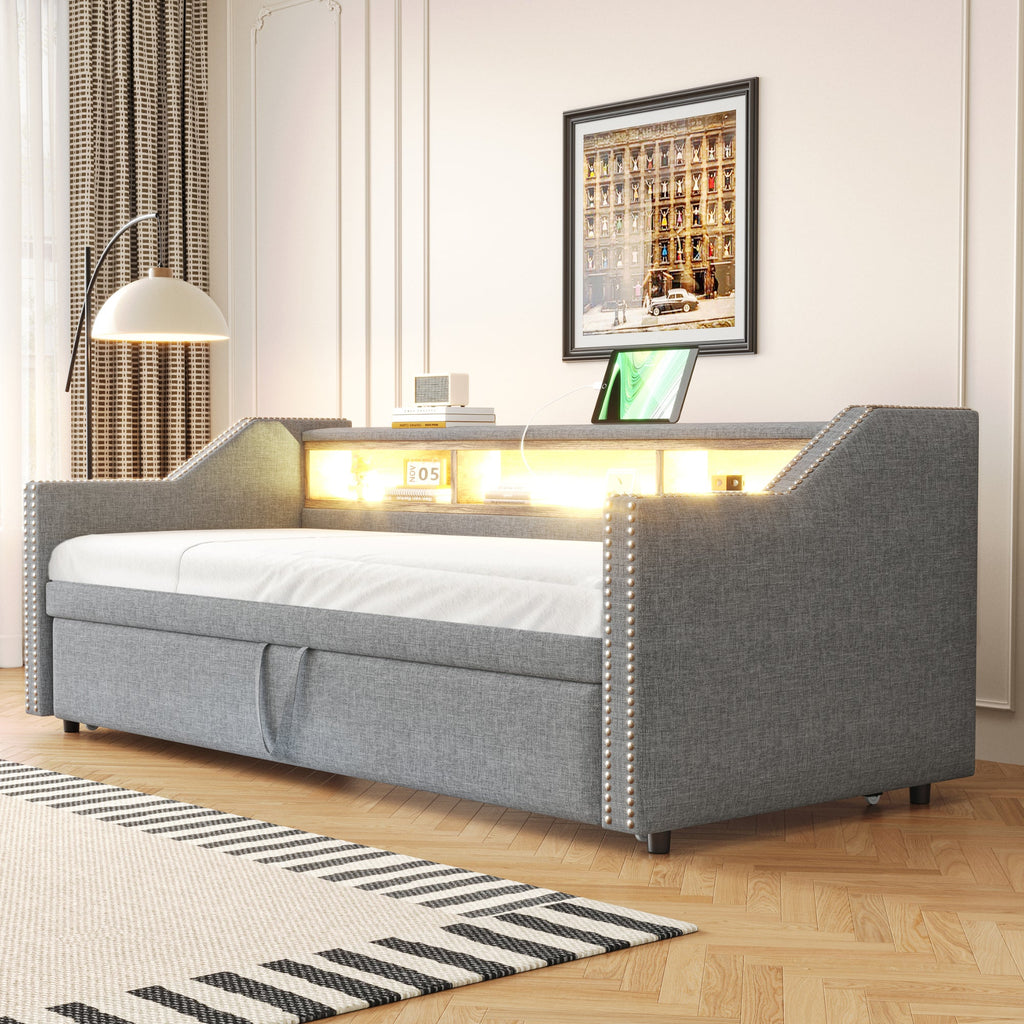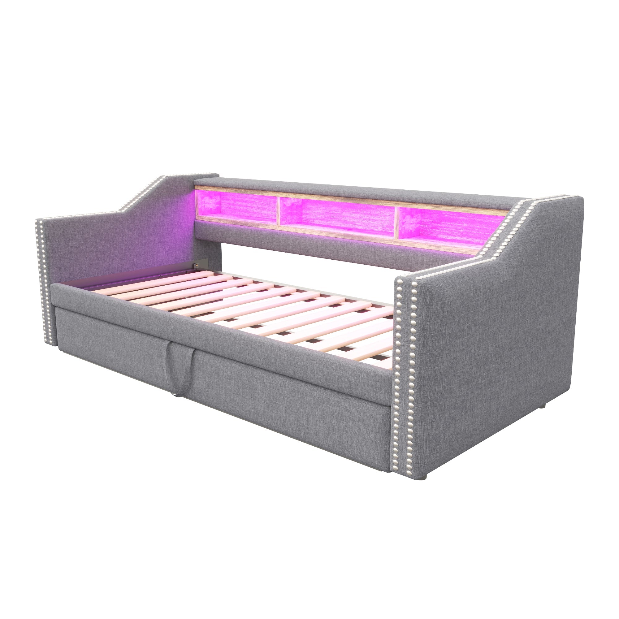 Upholstered Bed Pull-out Sofa Bed 90/180 x 190 cm with Storage, LED, USB, Slatted Frame, Light Grey