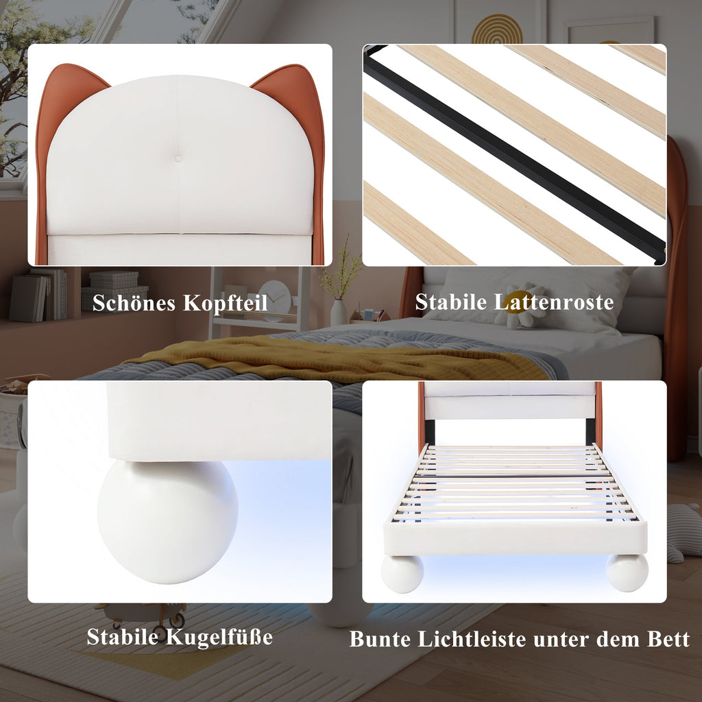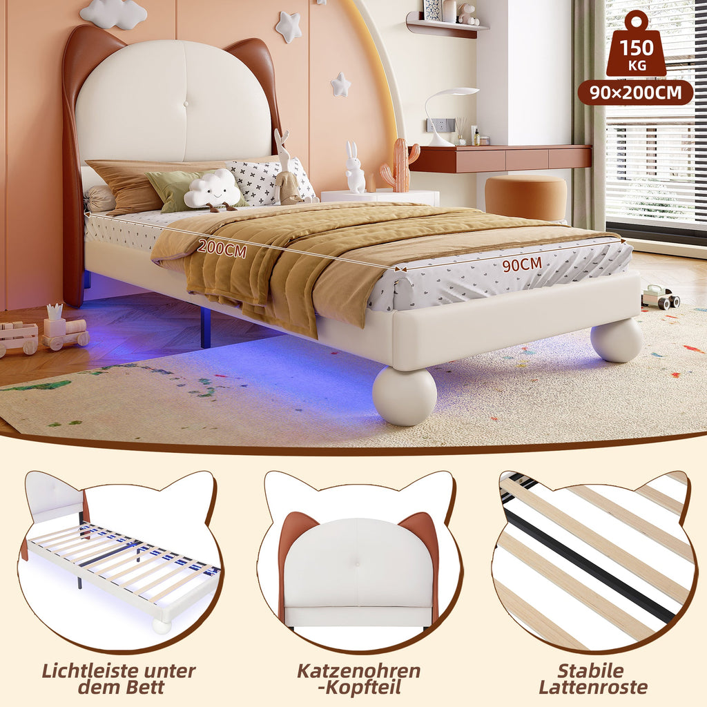 Upholstered Children's Bed with Cat-Ear Headboard and LED Light Strip, Beige + Yellow-Brown, 90x200