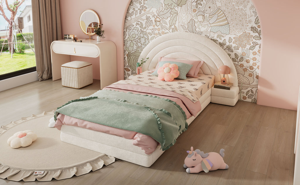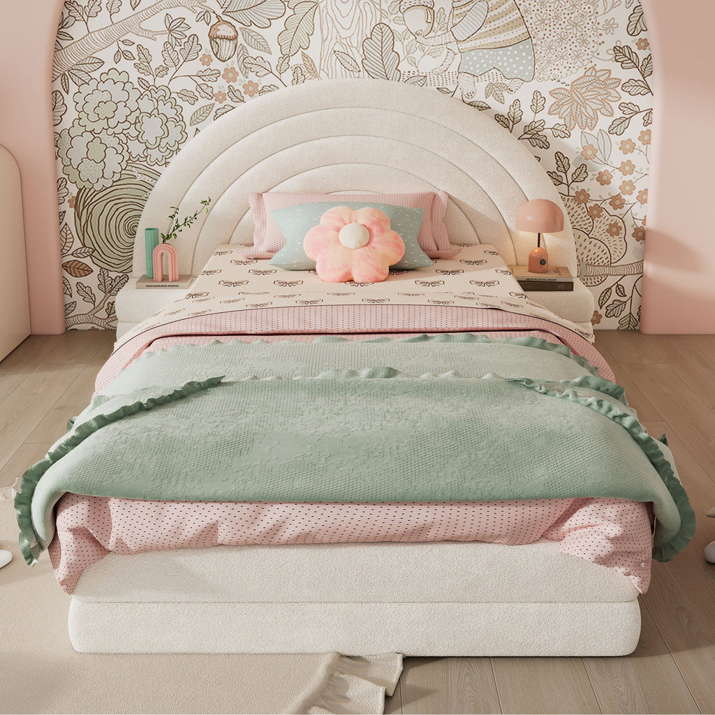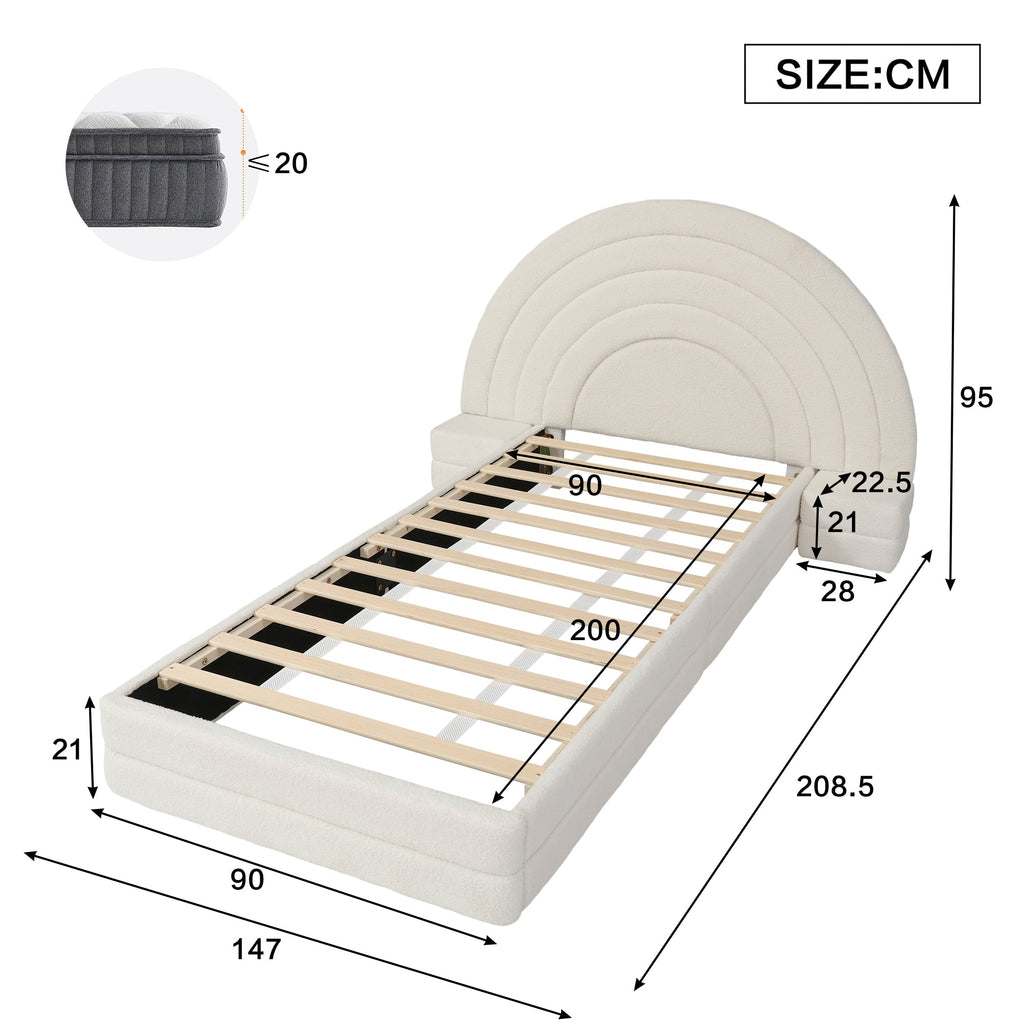 Upholstered Bed, Single with Rainbow Headboard & Side Tables, Fleece, Beige