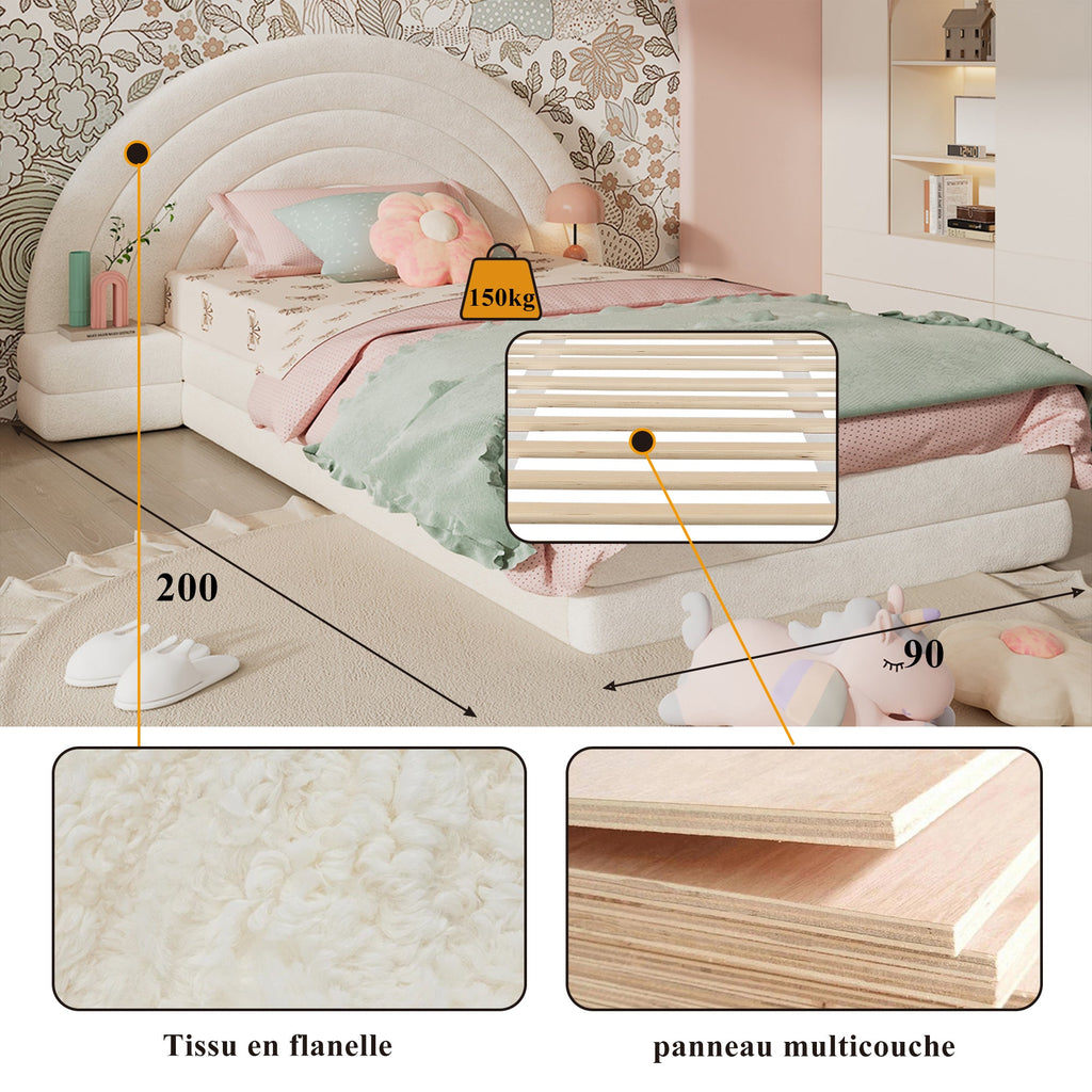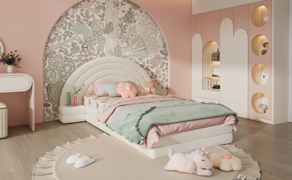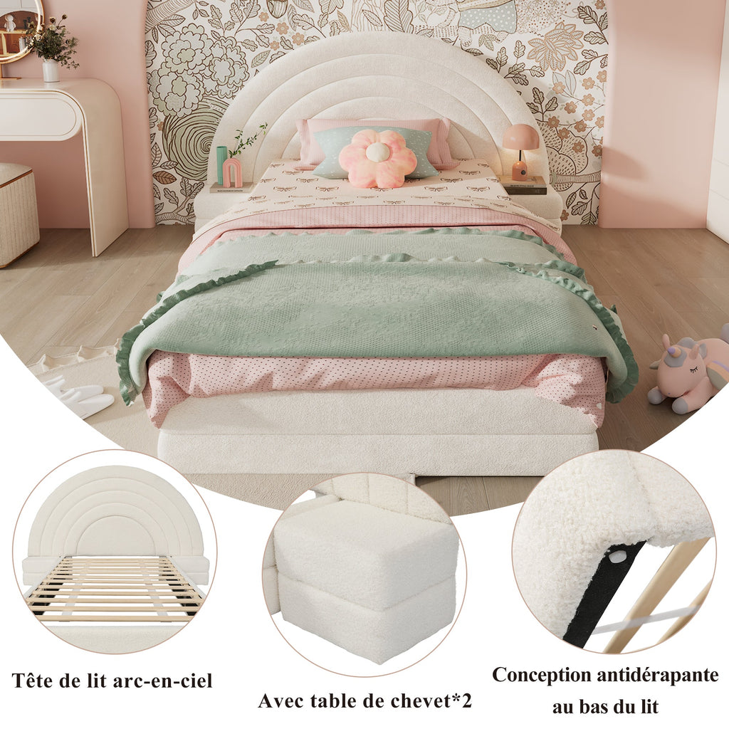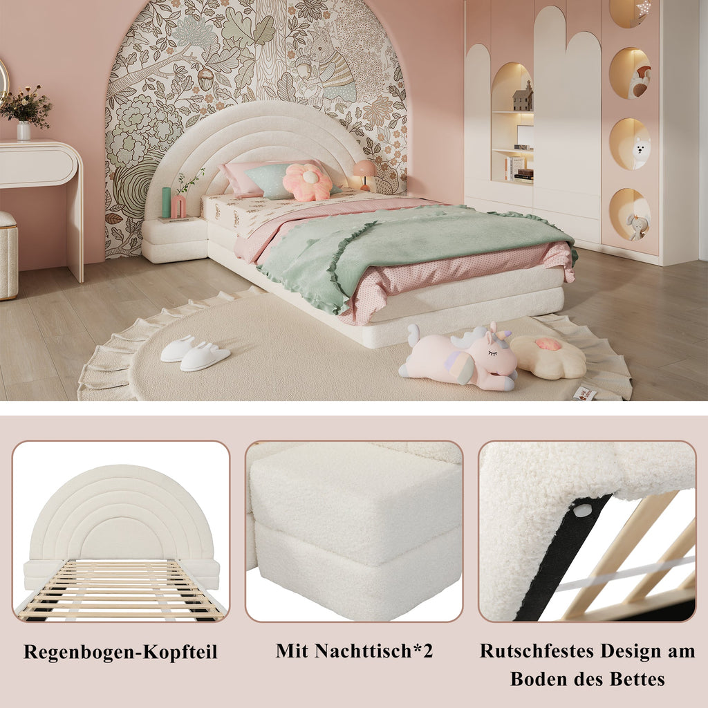 Upholstered Bed, Single with Rainbow Headboard & Side Tables, Fleece, Beige