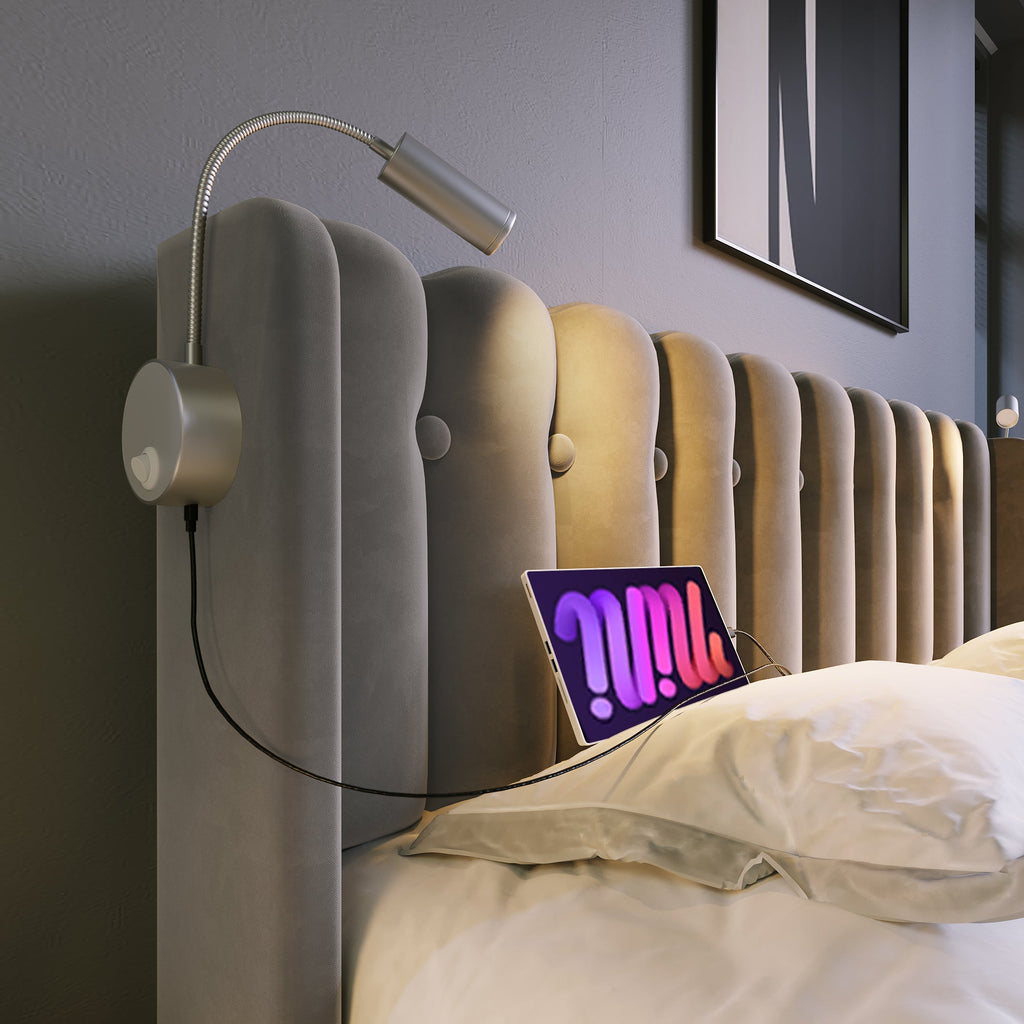 Upholstered Bed Single with Reading Light, Charging, Storage, Slatted Frame, Velvet Gray