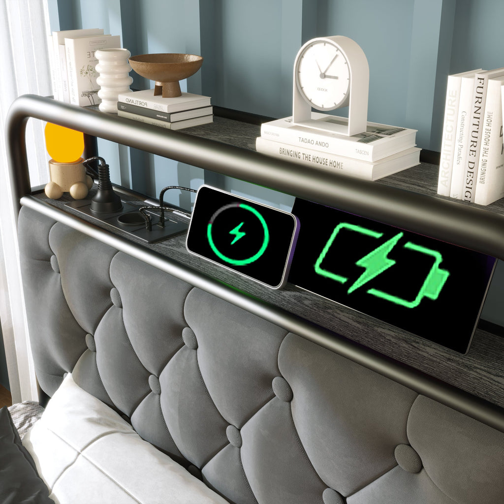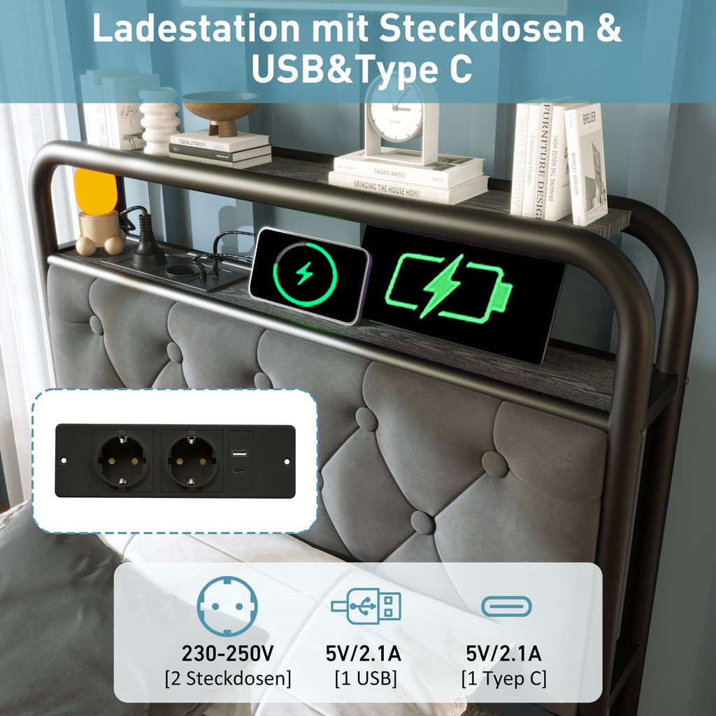 Upholstered Bed, Single with USB Type C & LED, 90x200cm, Velvet (with mattress)