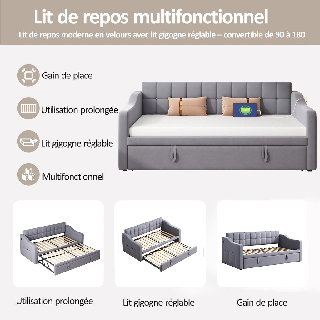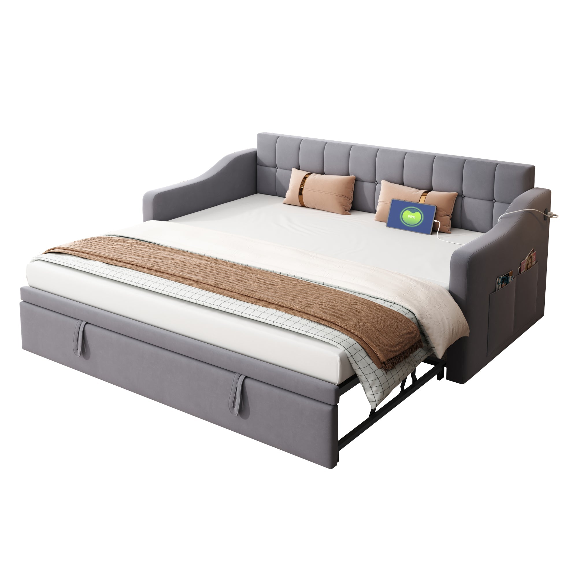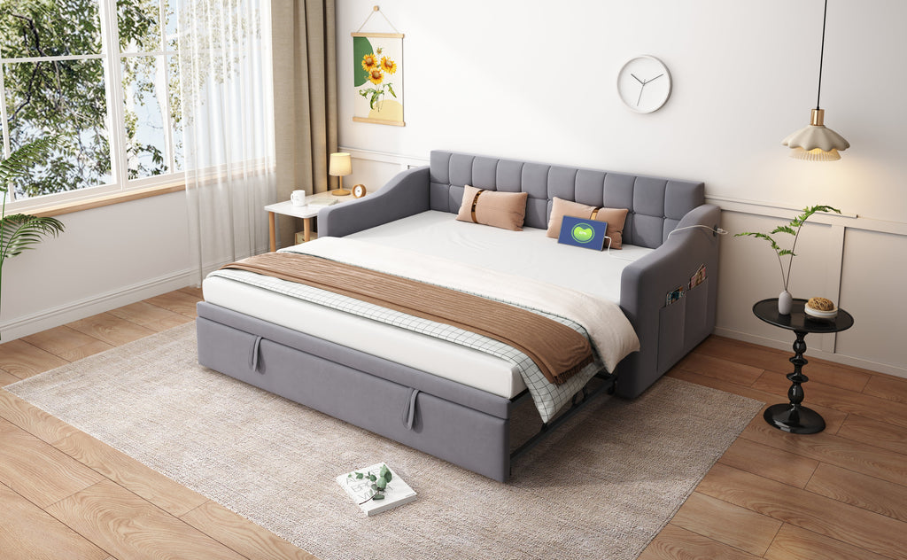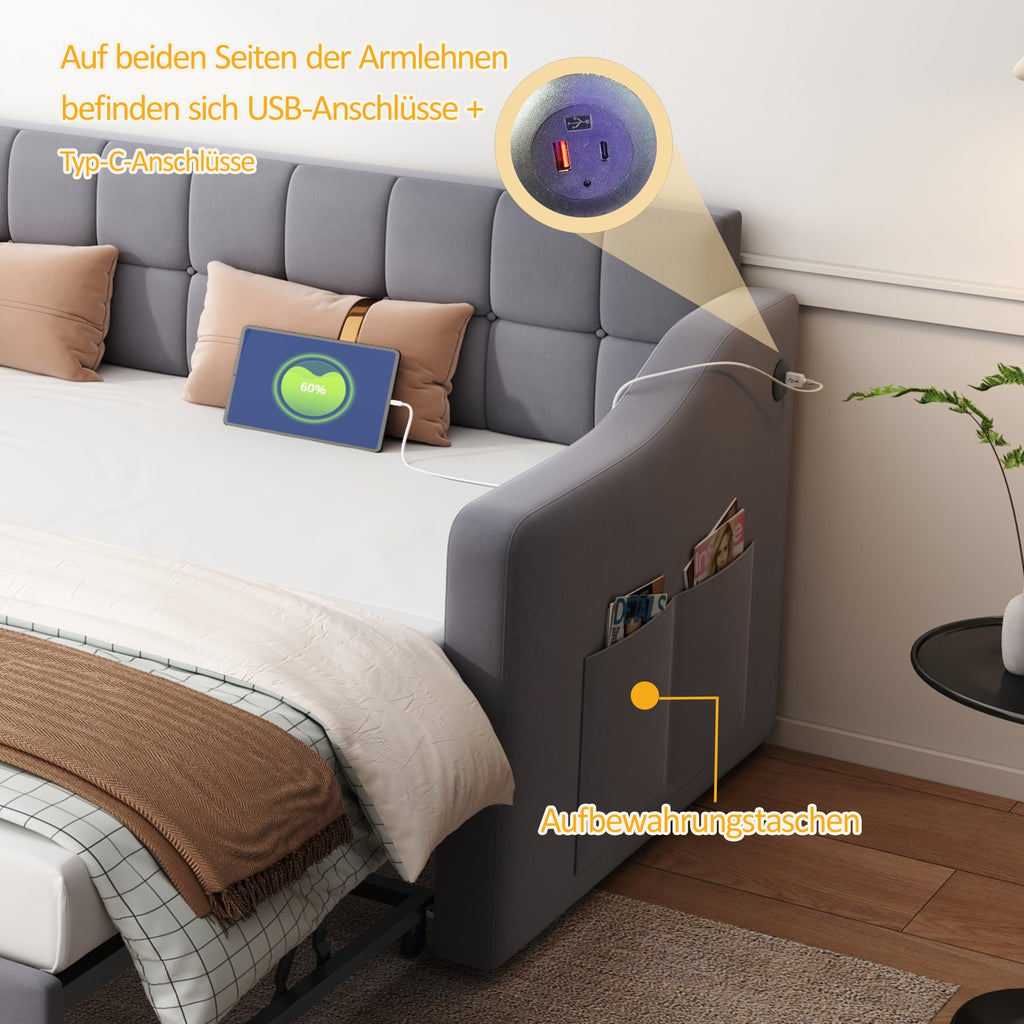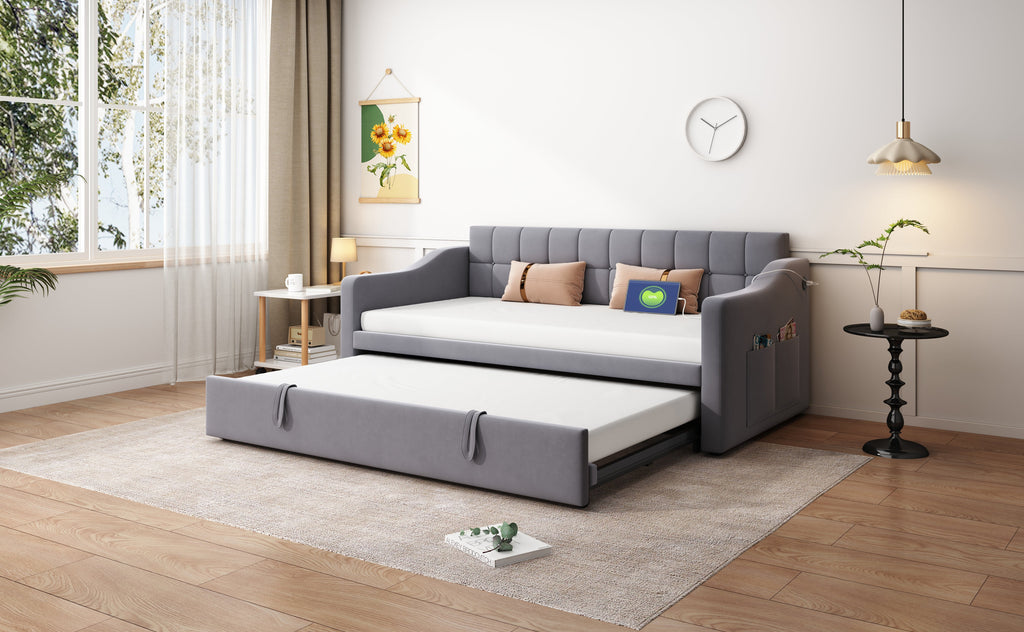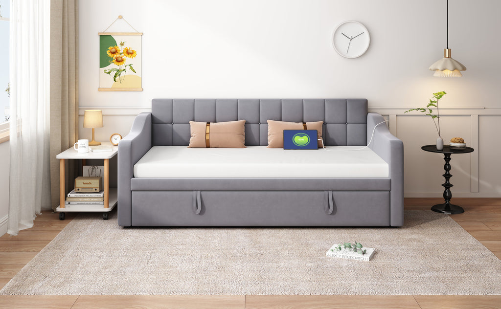 Upholstered Bed Sofa, 2-in-1 Multifunctional with Socket & Storage, Gray Velvet