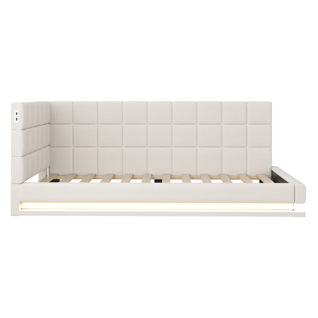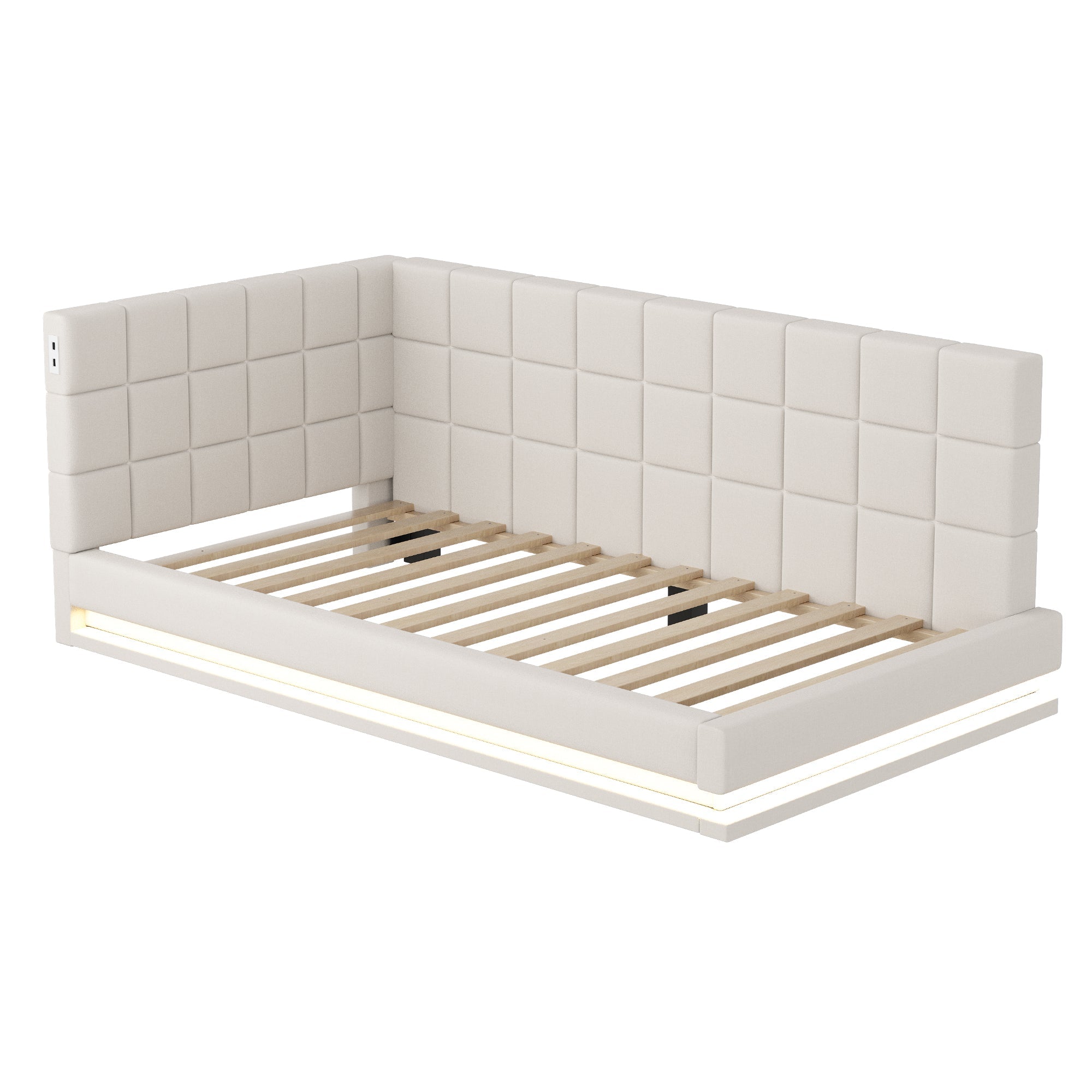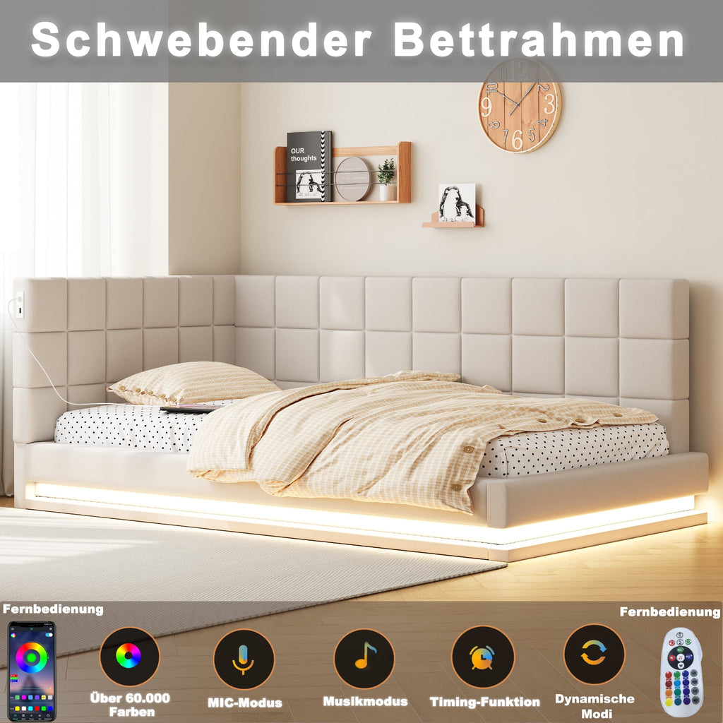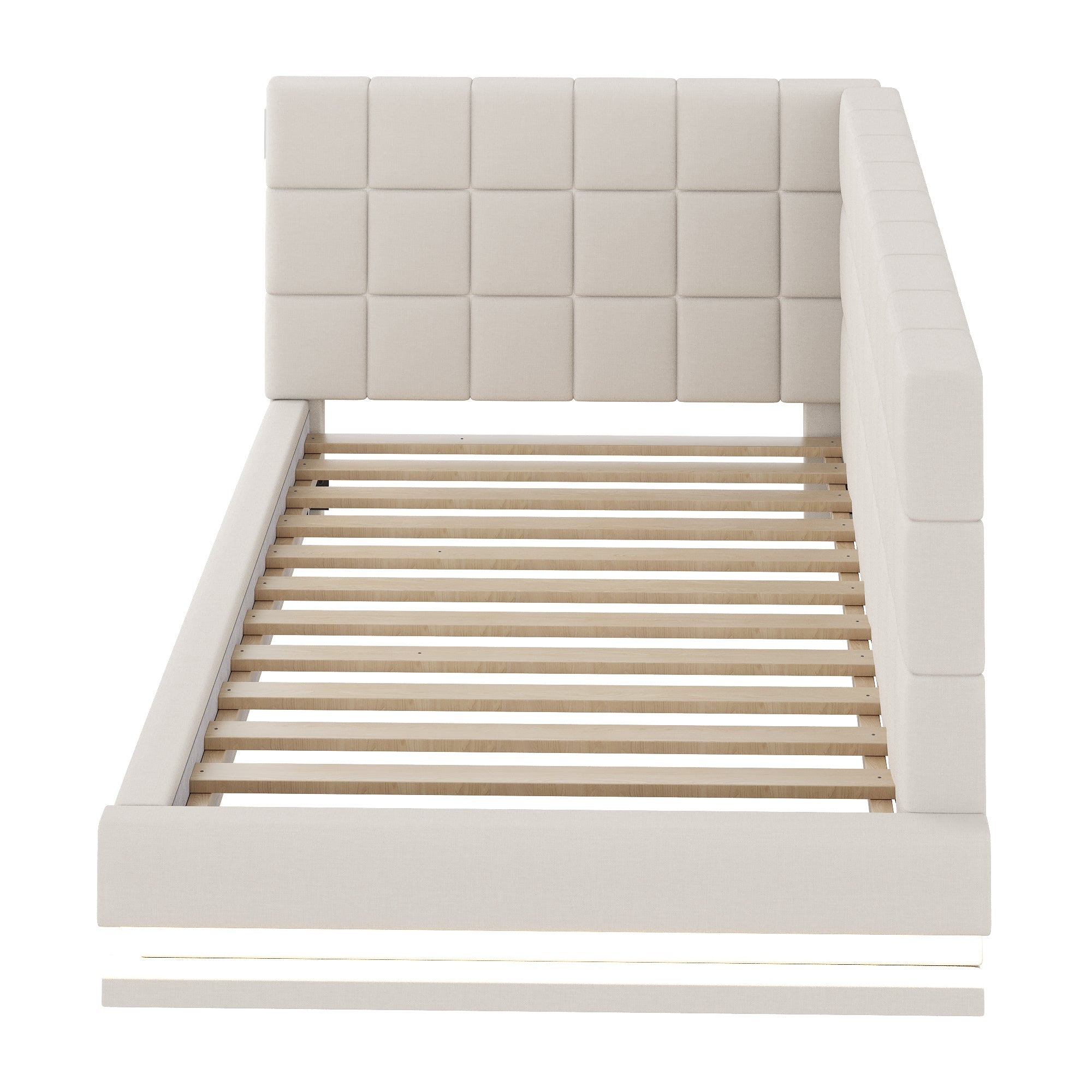 Upholstered Bed Sofa, 90x200 Multifunctional with LED & USB, Linen Fabric, Beige