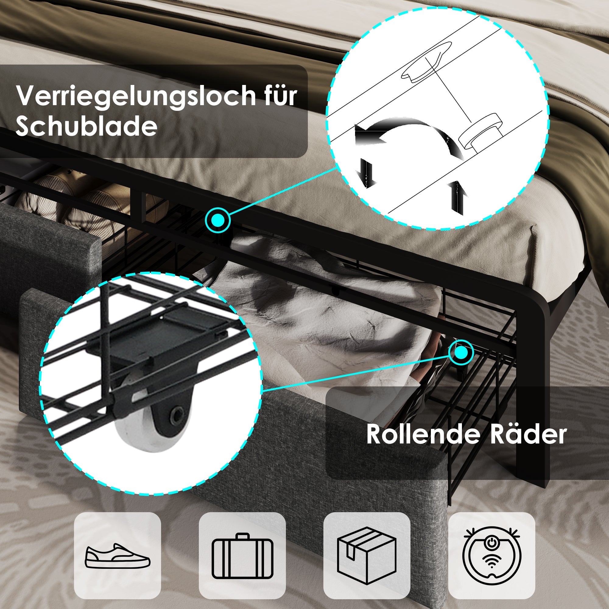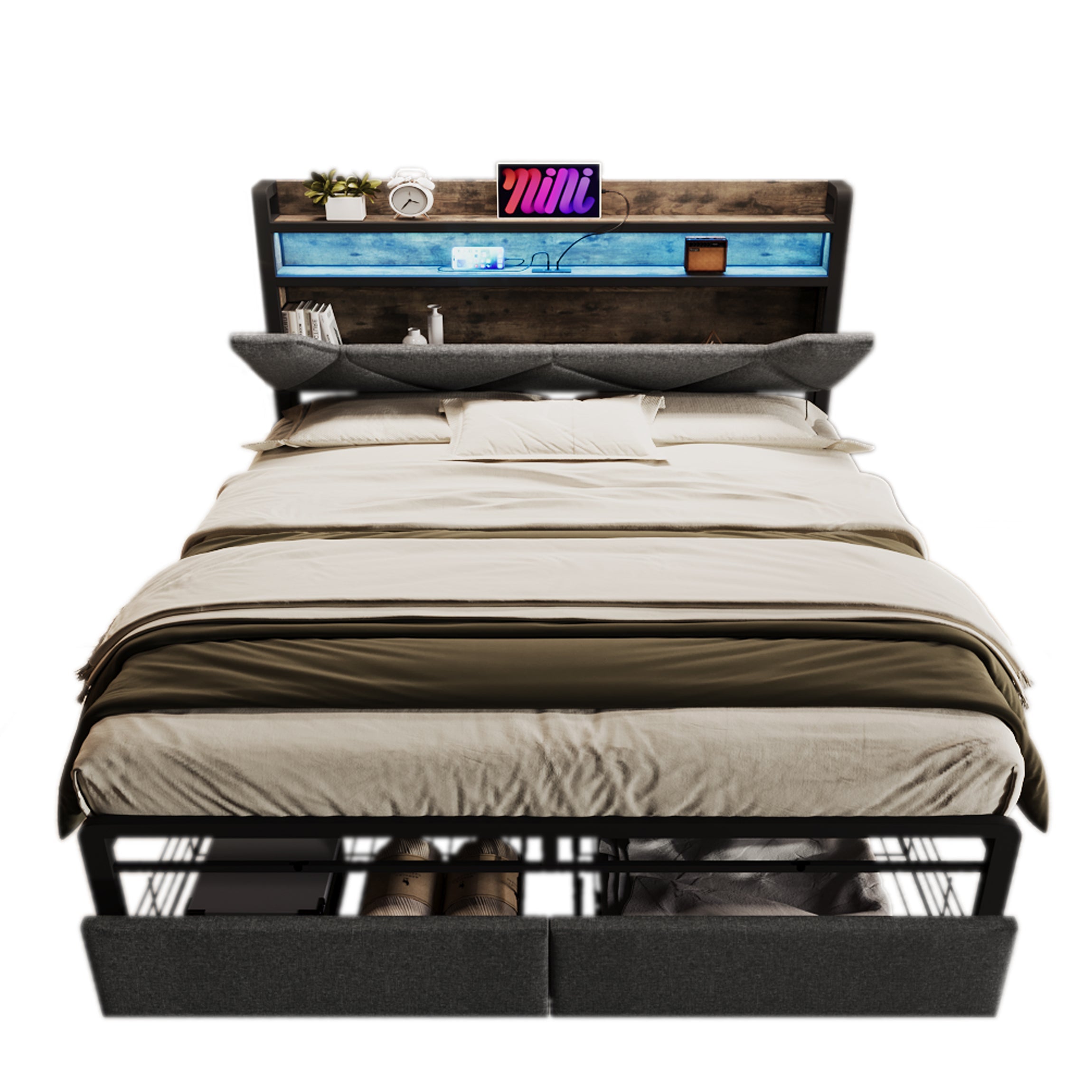 Upholstered Bed, USB-C, Storage Headboard, LED, Drawers, 140x200cm, Metal Frame, Gray
