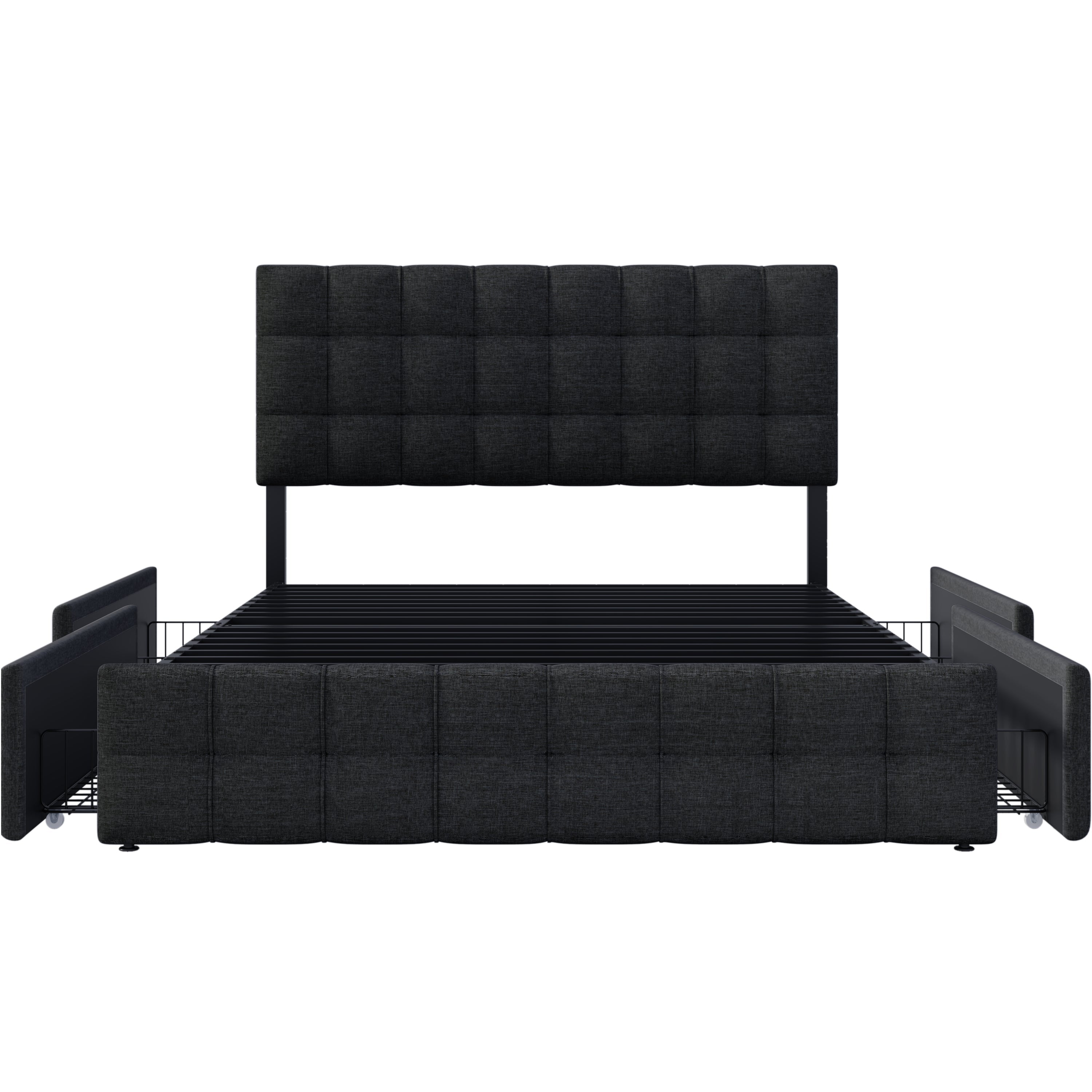 Upholstered Bed with 4 Drawers, Adjustable Headboard, 140x200cm, Black Linen