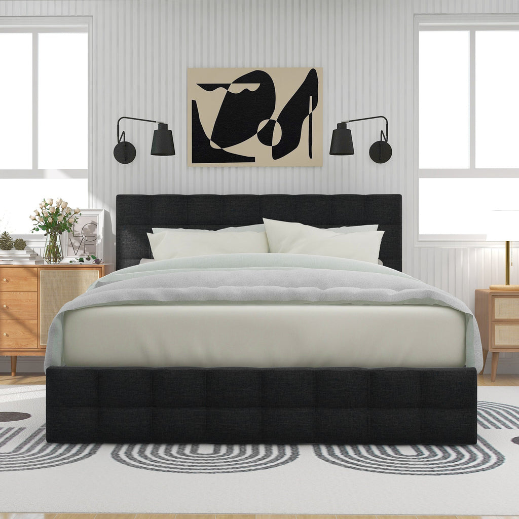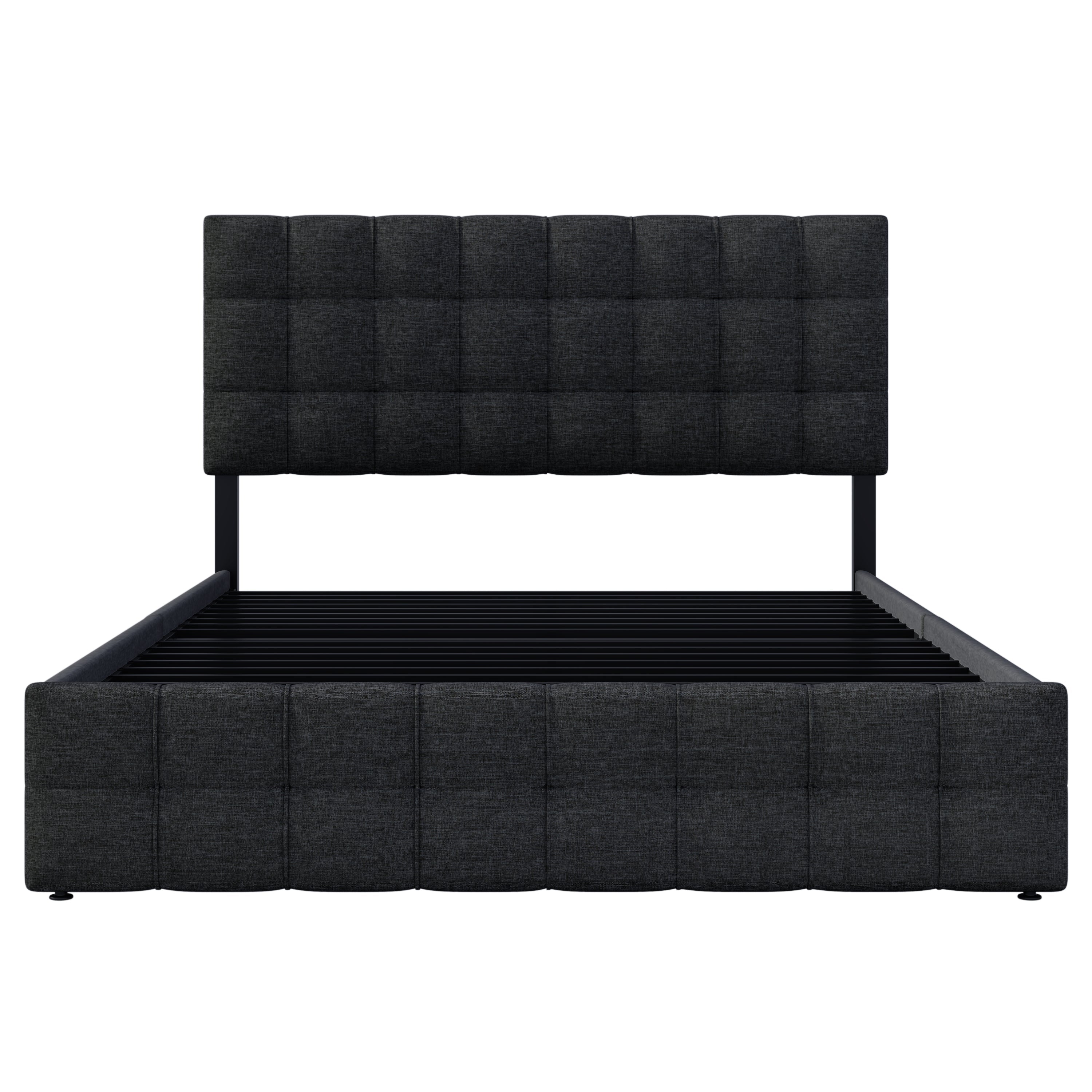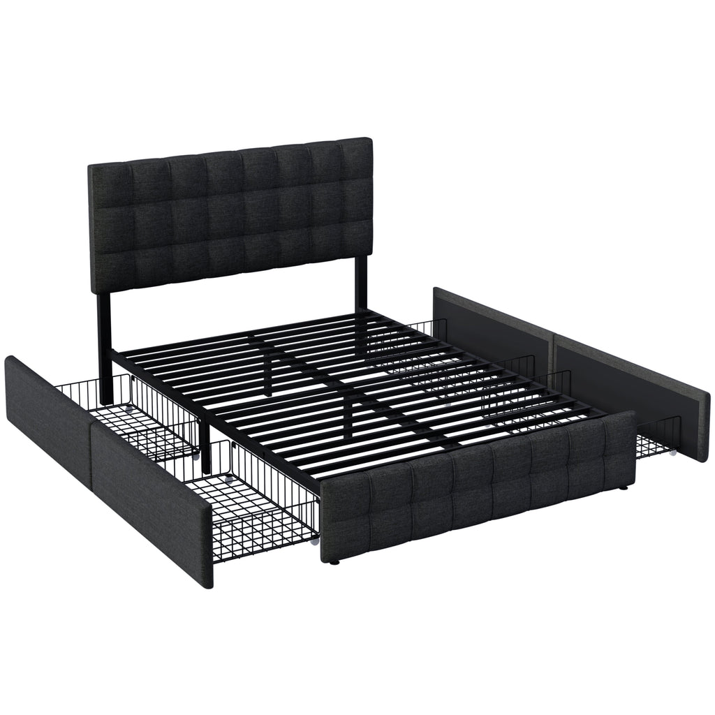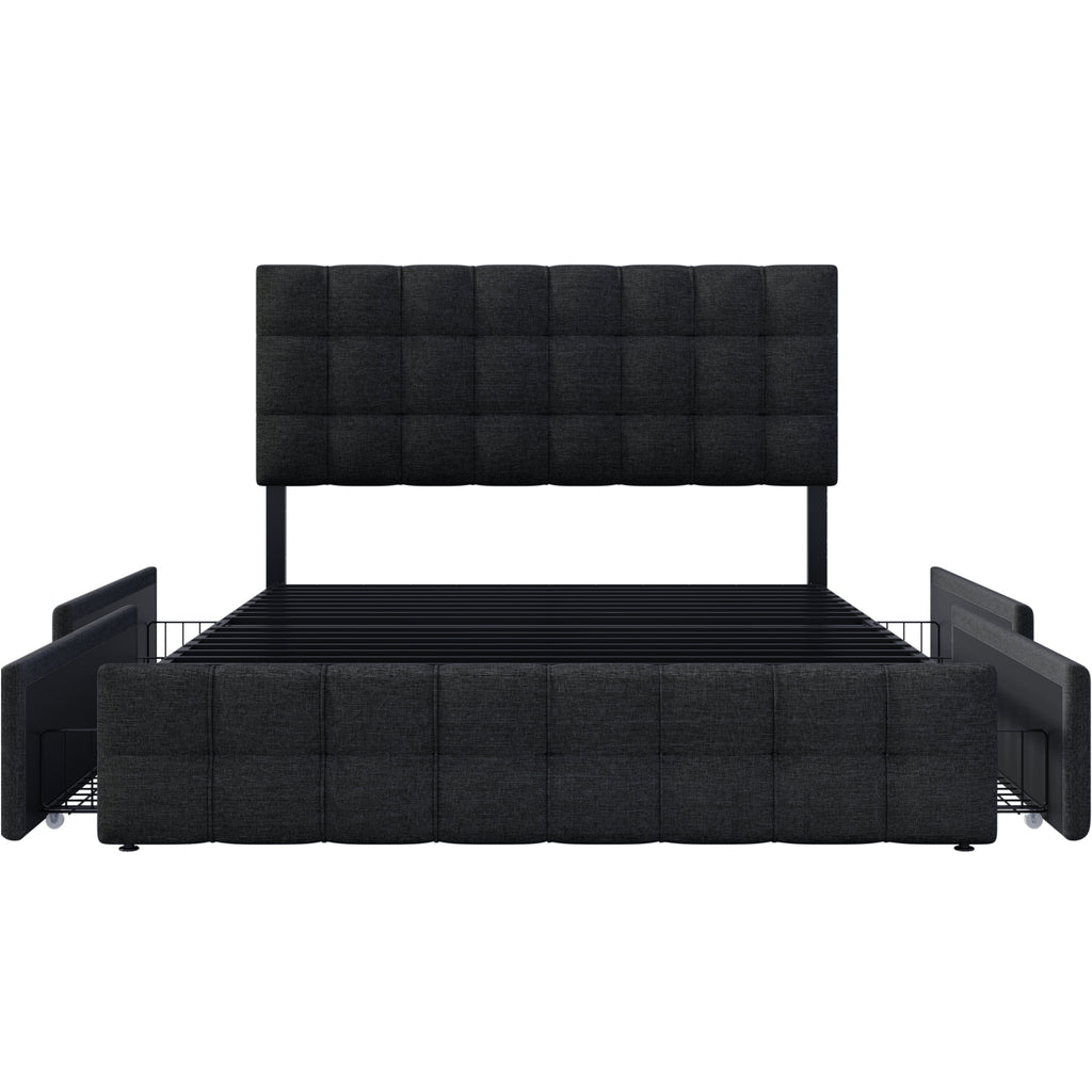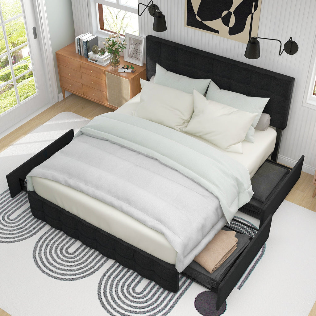 Upholstered Bed with 4 Drawers, Spring Mattress, Black Linen