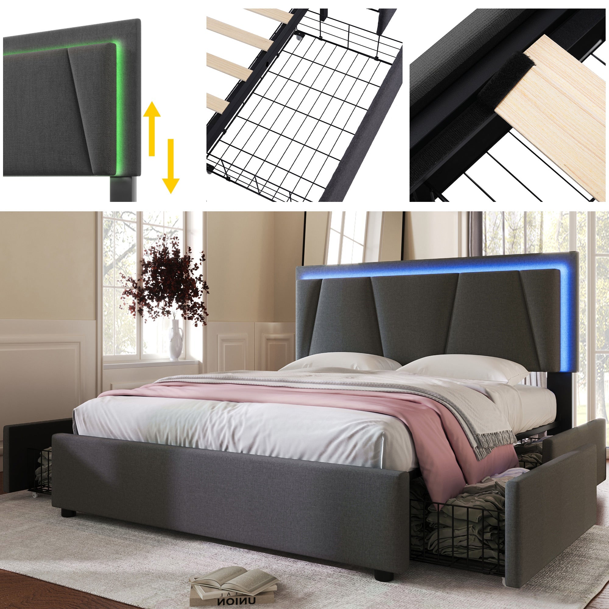 Upholstered Bed with LED Lighting, 4 Drawers, Adjustable Headboard, Gray