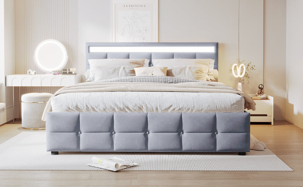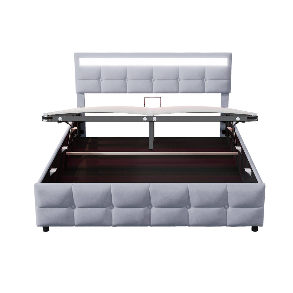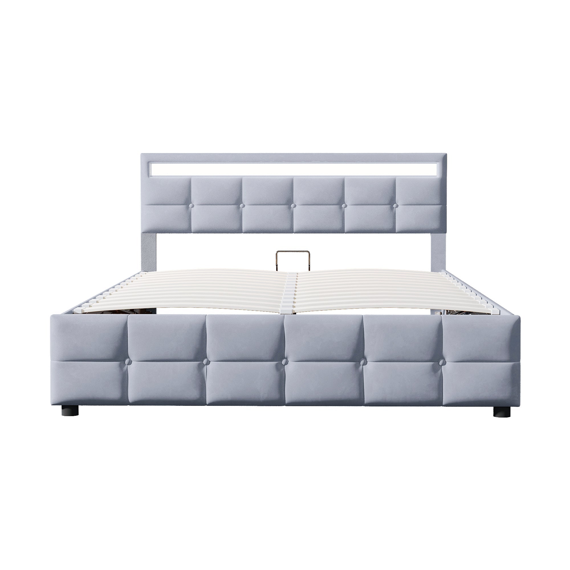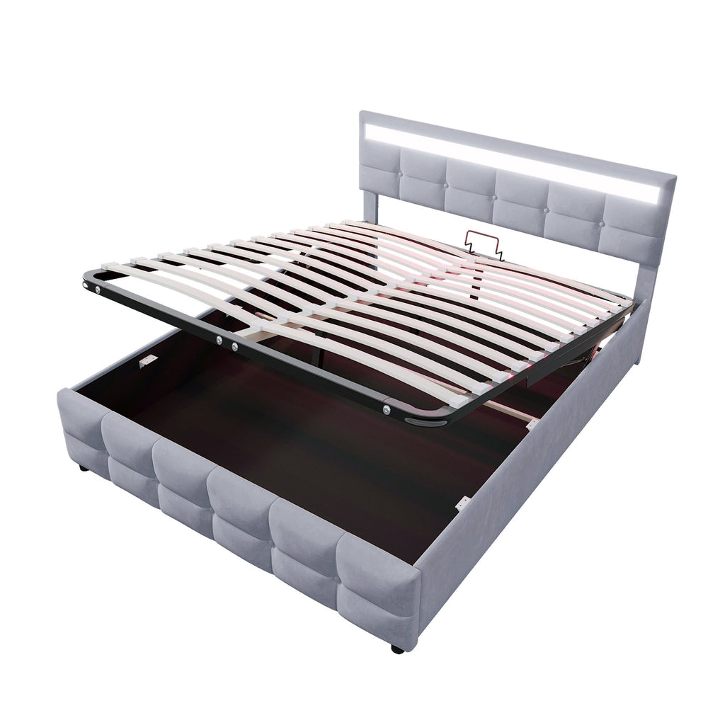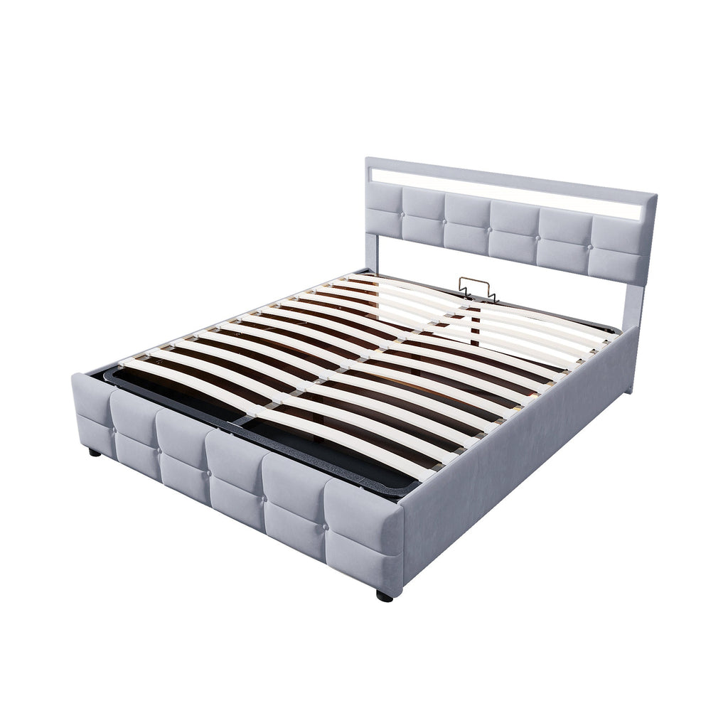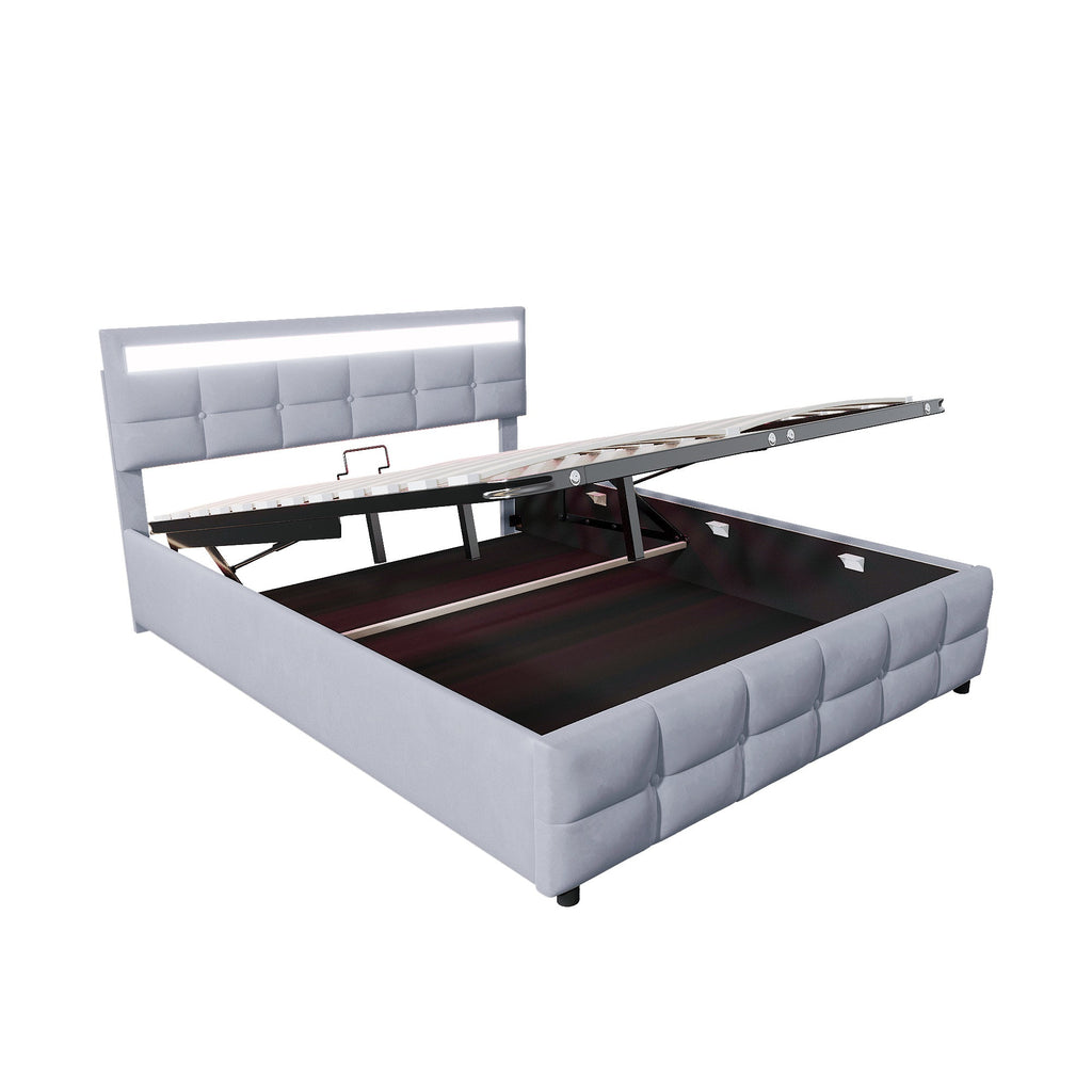 Upholstered Bed with LED Lights, Slatted Frame, Hydraulic, Dutch Velvet Fabric, Grey