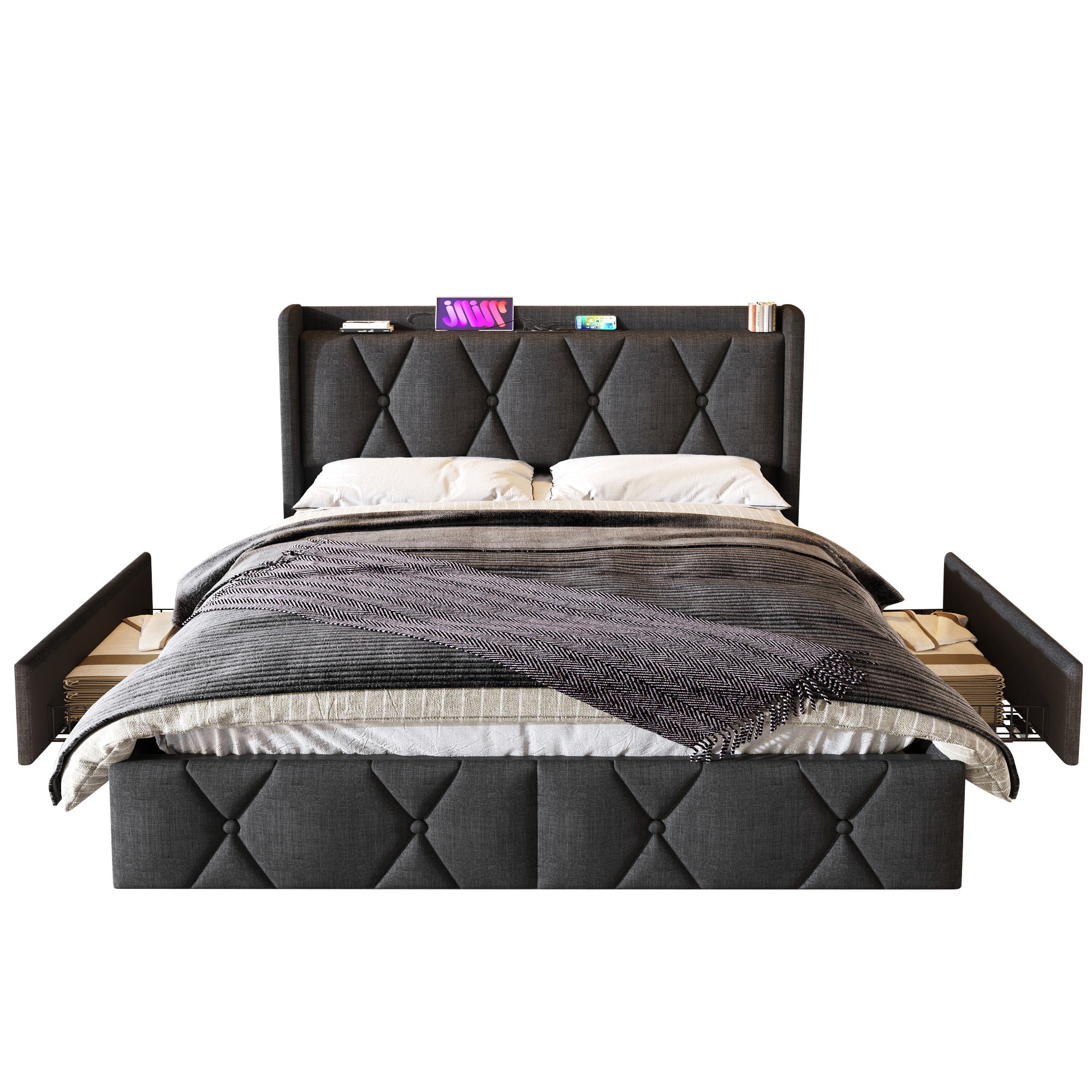 Upholstered Bed with USB Charging Headboard, 4 Drawers, 140x200cm, Gray