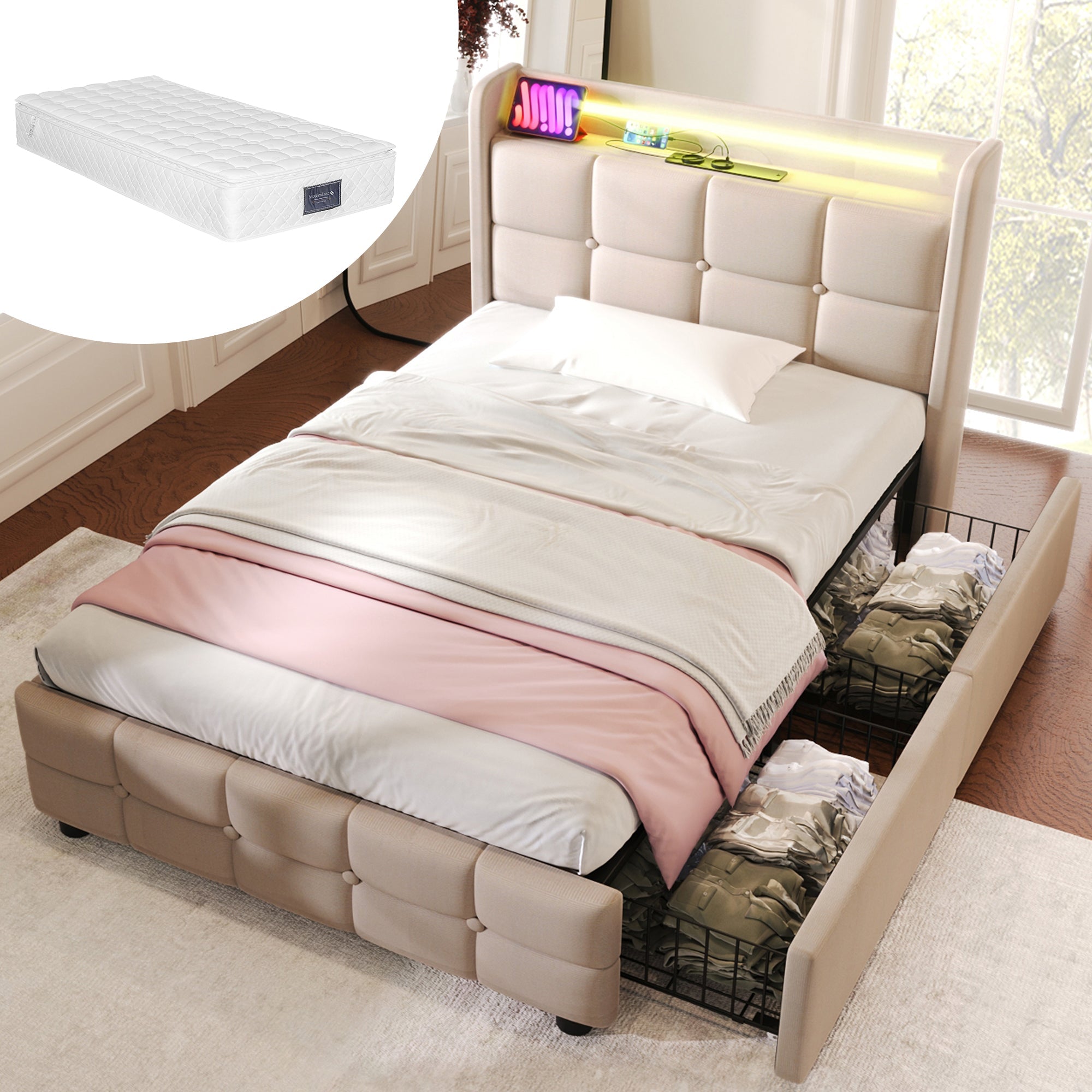 Upholstered Bed with USB Charging, LED Headboard, 2 Drawers, Single, Beige Linen