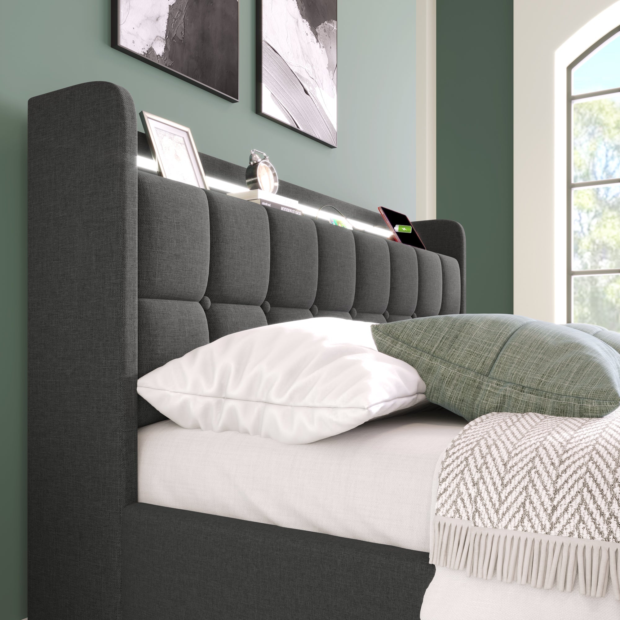 Upholstered Bed with USB, LED & Storage Drawers, Gray