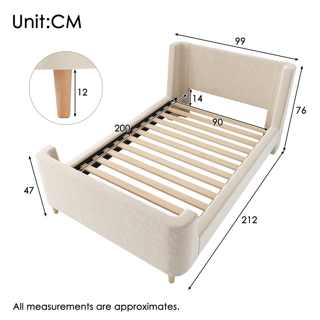 Upholstered Children's Bed, Single Sleigh with Cosmic Pattern, Beige Velvet