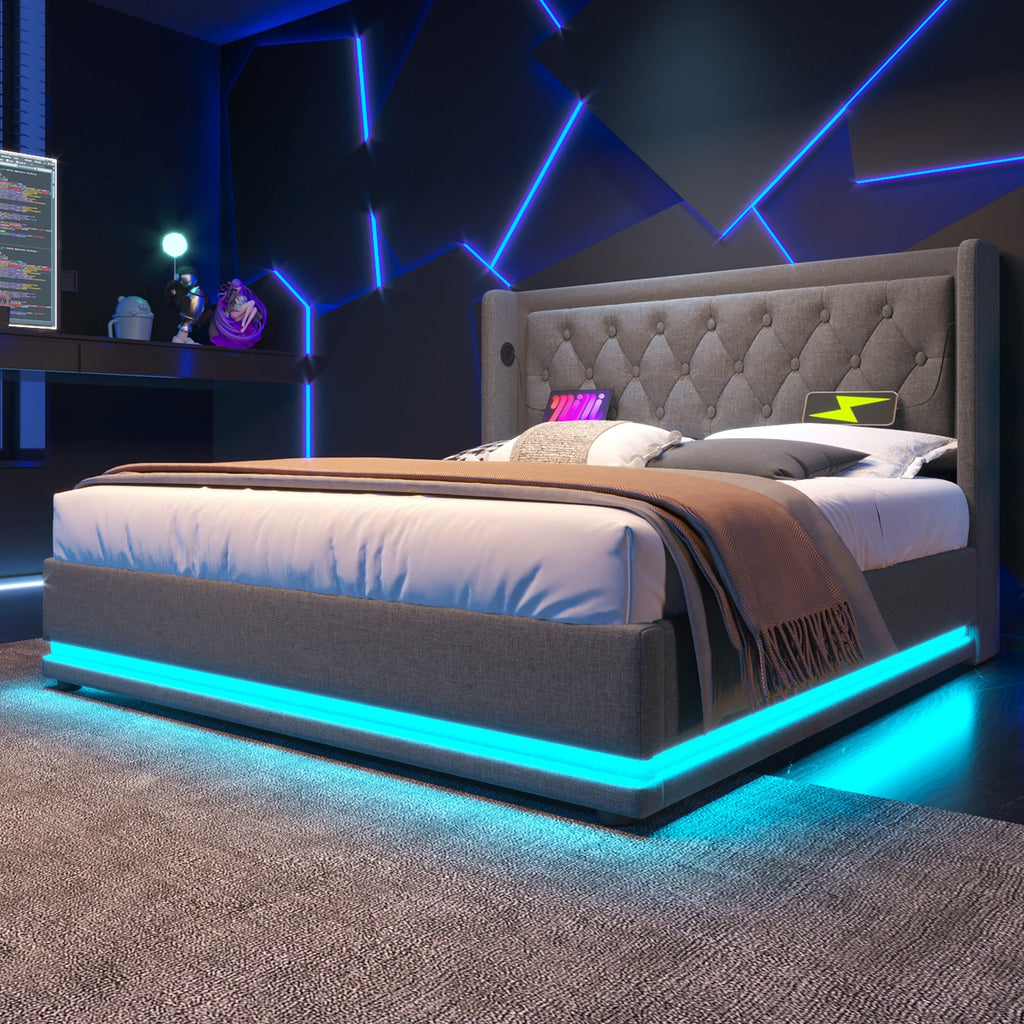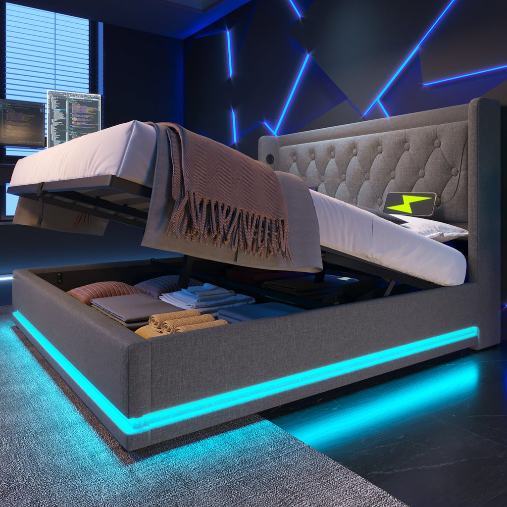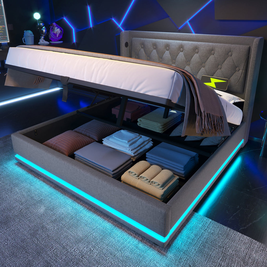 Upholstered Double Bed, 140*200 cm, Hydraulic Storage with USB & LED, Gray Cotton