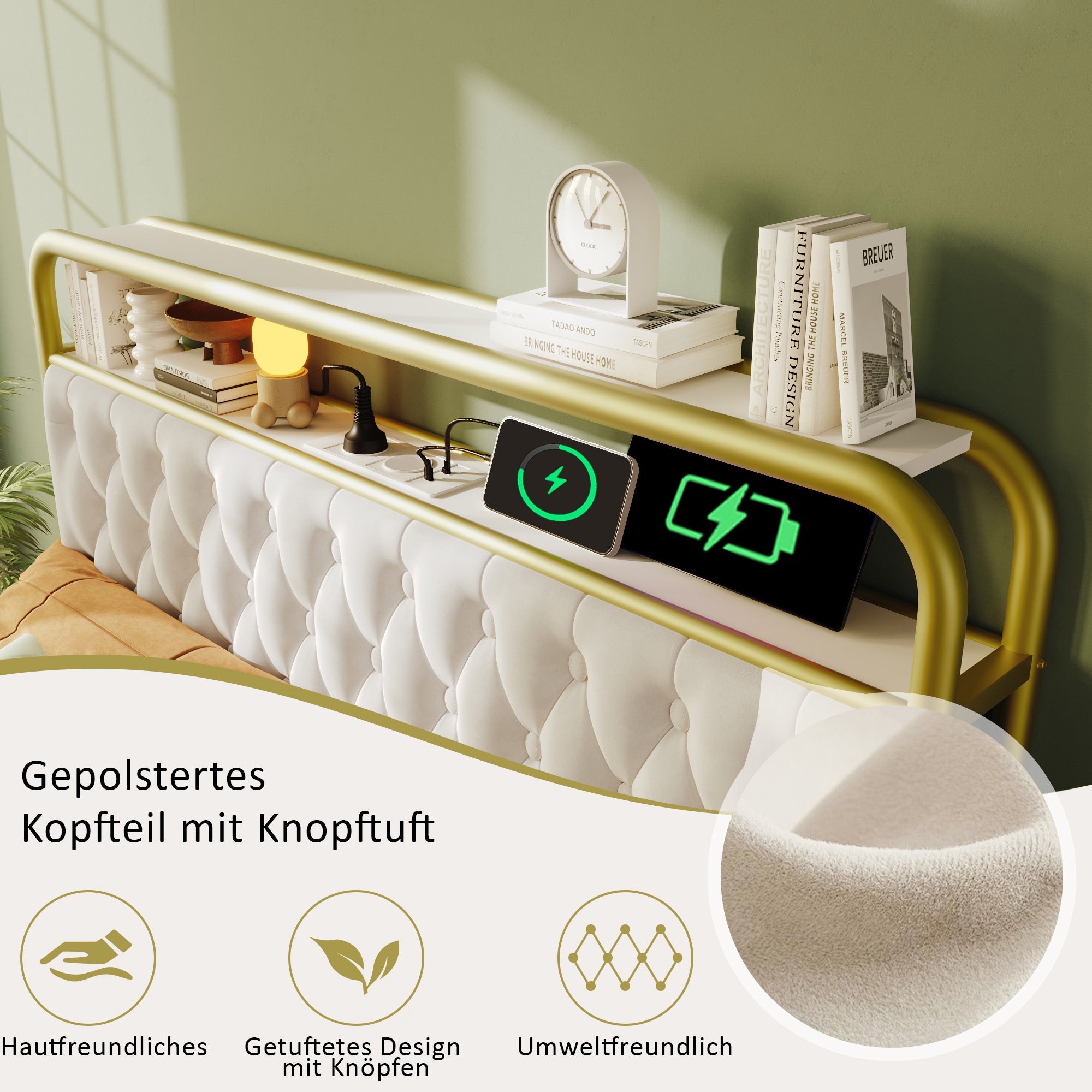 Upholstered Double Bed, 140x200 Metal Frame with USB Type C, LED & 4 Drawers, Velvet