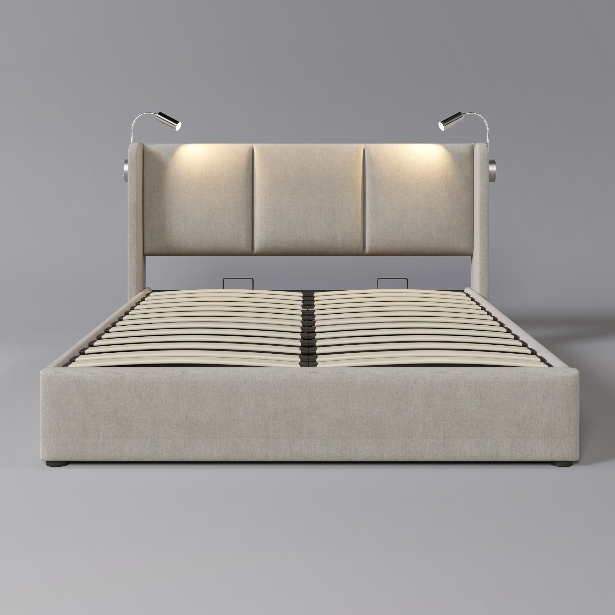 Upholstered Double Bed, 140x200 Storage USB Reading Light, Linen Material