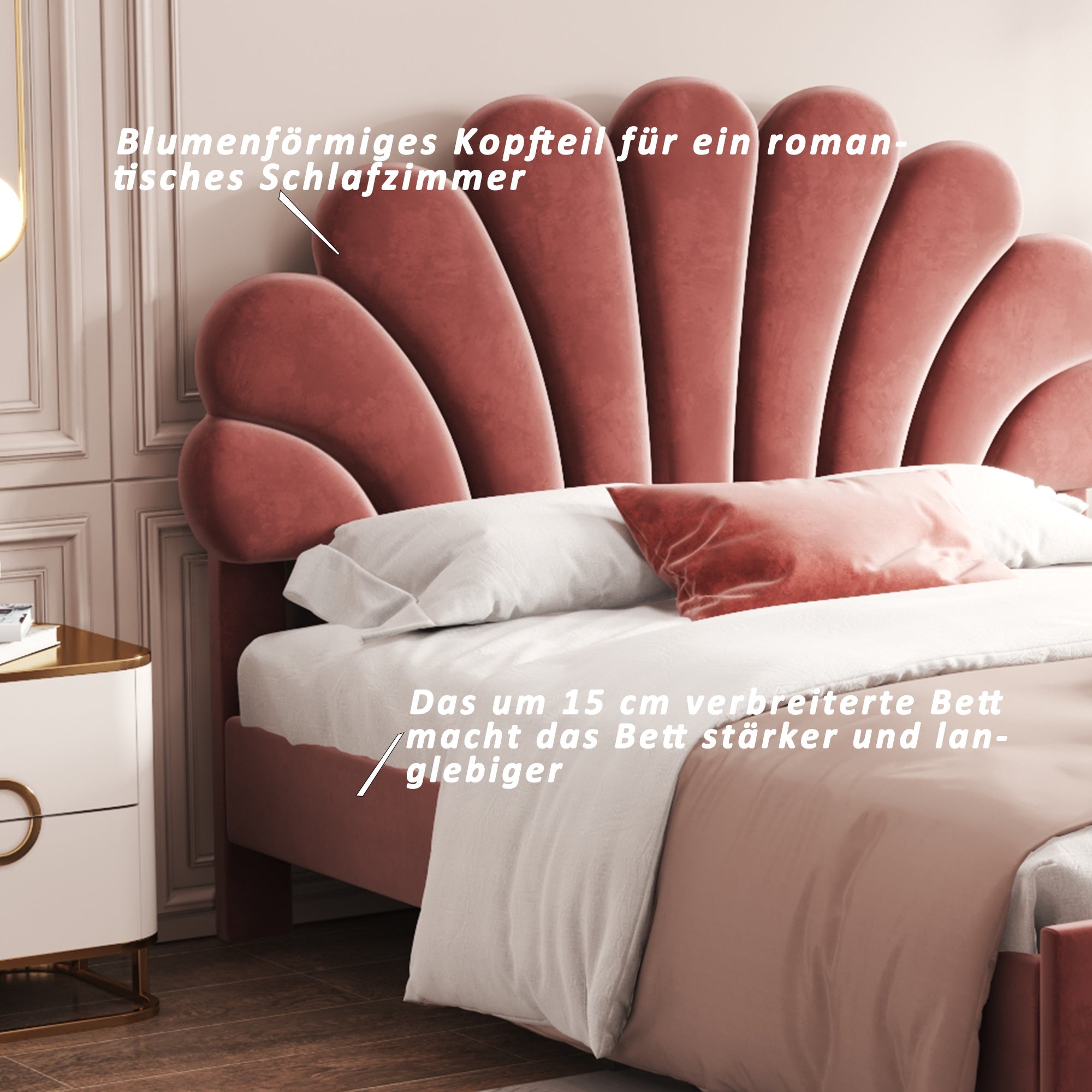 Upholstered Double Bed, 140x200cm Flower Headboard, Velvet Bean Red