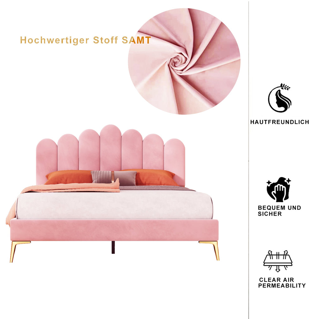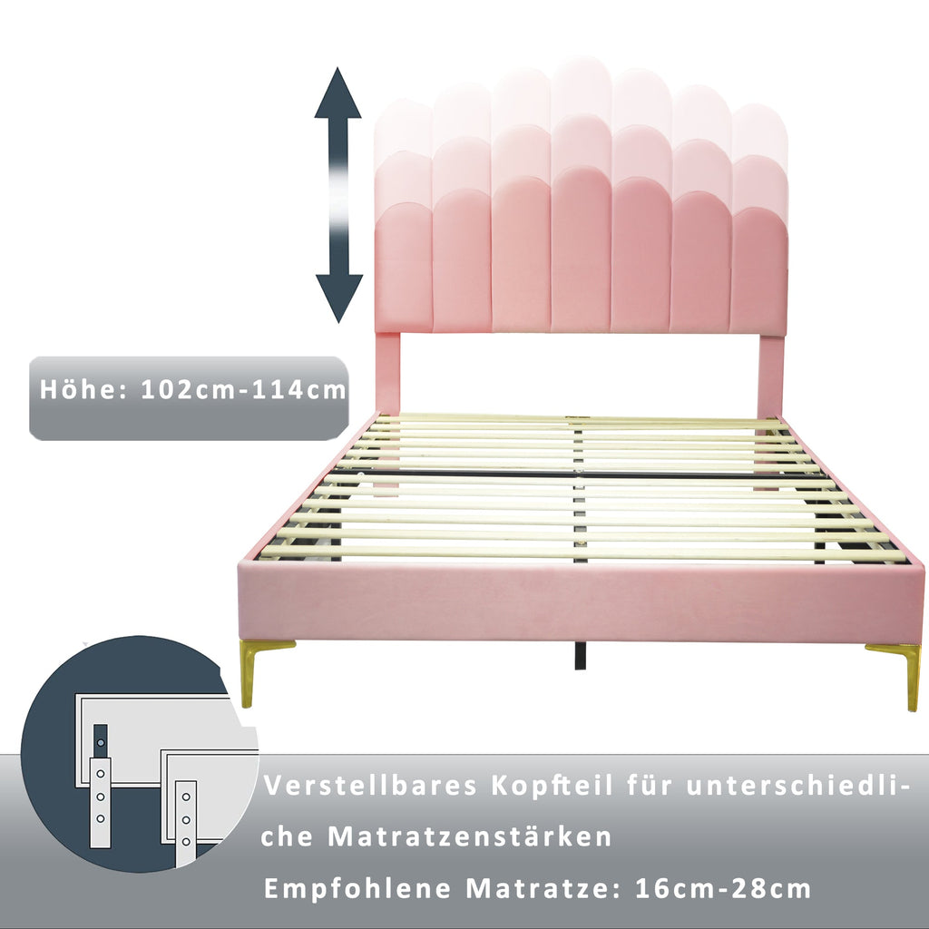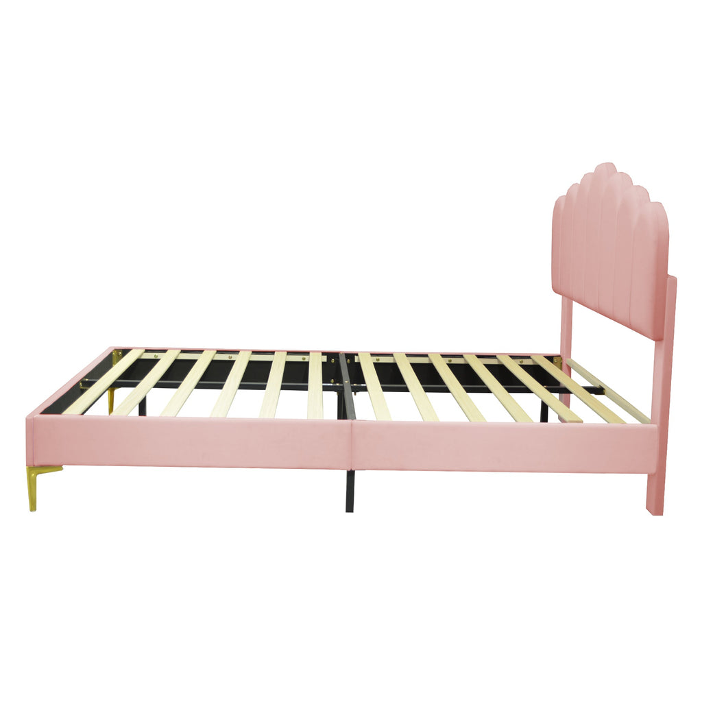 Upholstered Double Bed, 140x200cm, Headboard & Slatted Frame, Velvet Pink