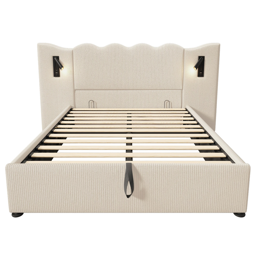 Upholstered Double Bed, 160x200 with Reading Lamp, USB-C & Storage, Beige-White Corduroy