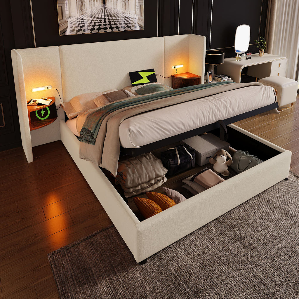 Upholstered Double Bed 180x200 with Bedside Table, Reading Lamp, USB-C Charging, Beige Linen