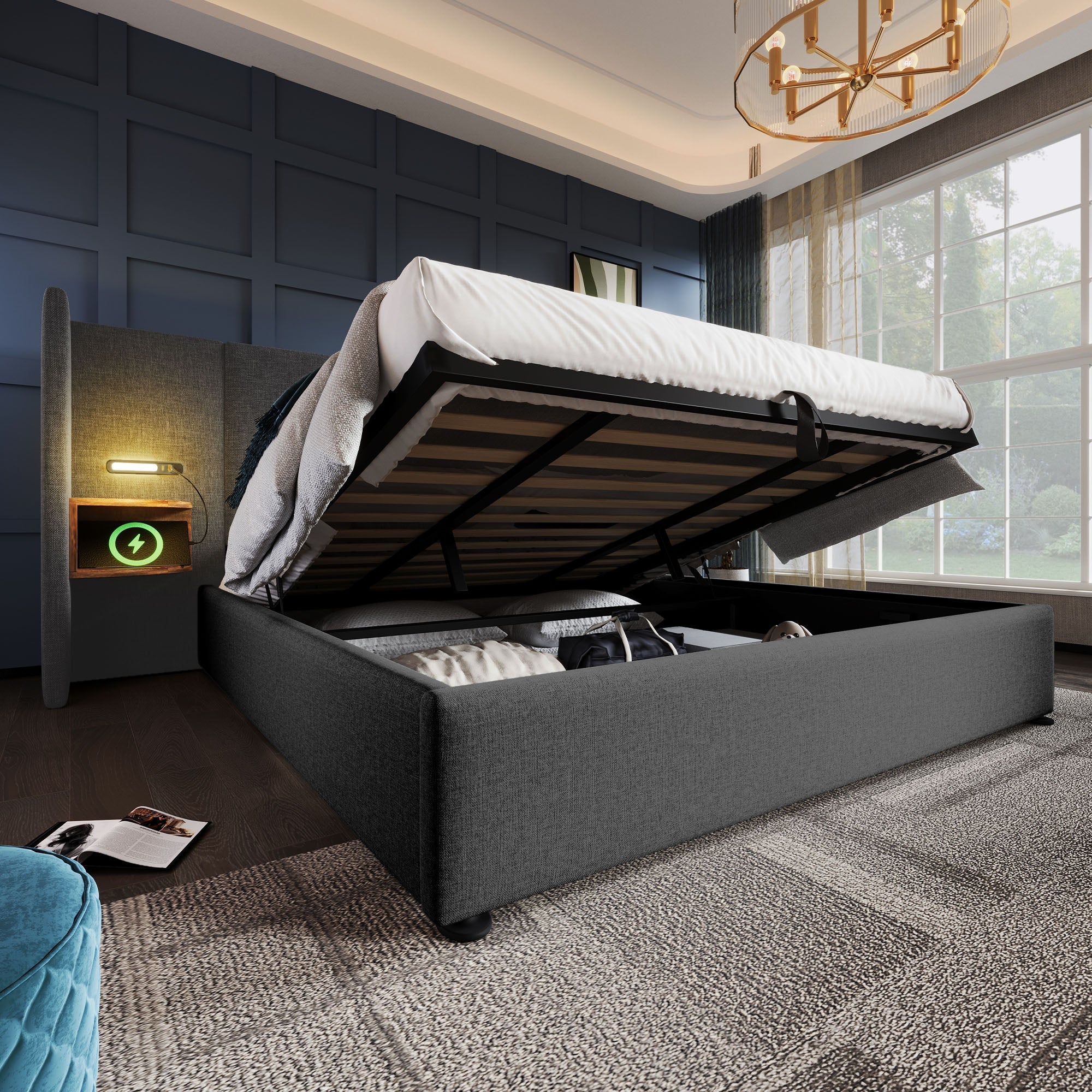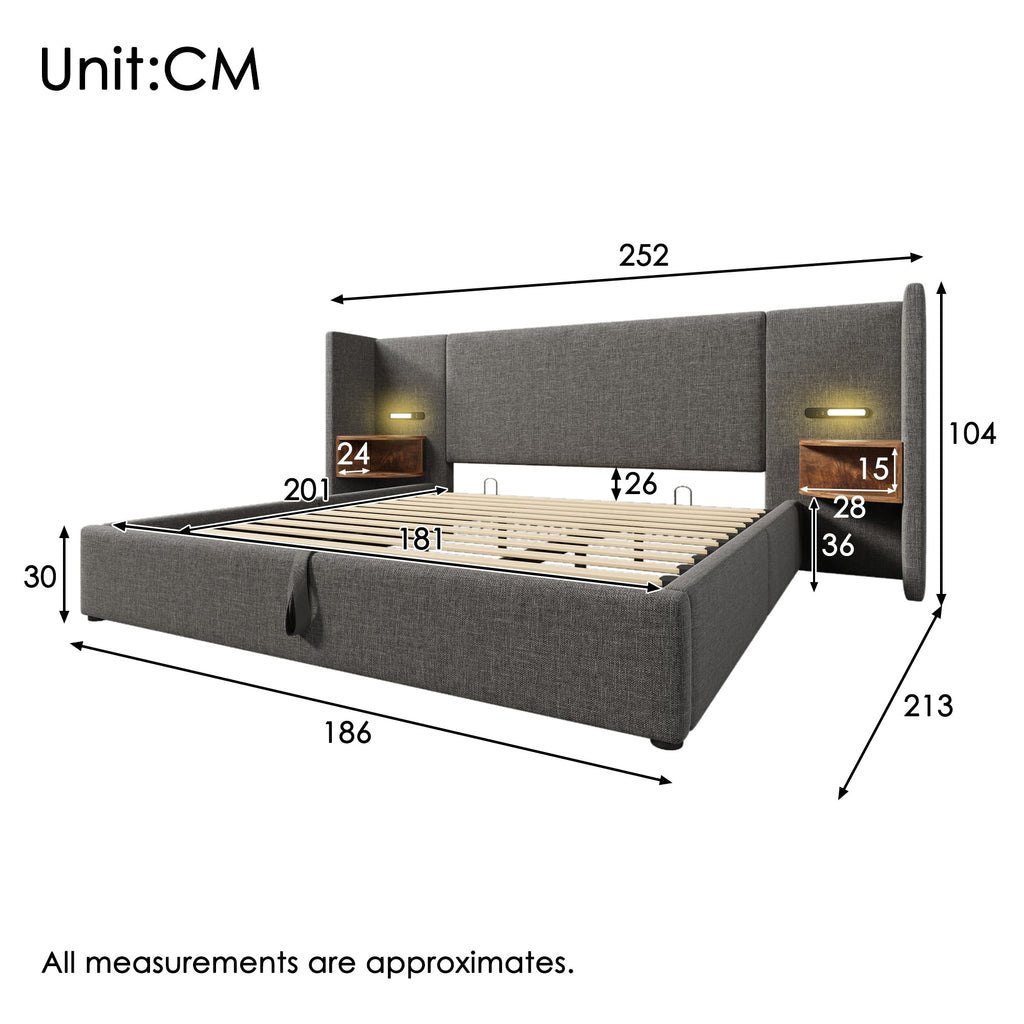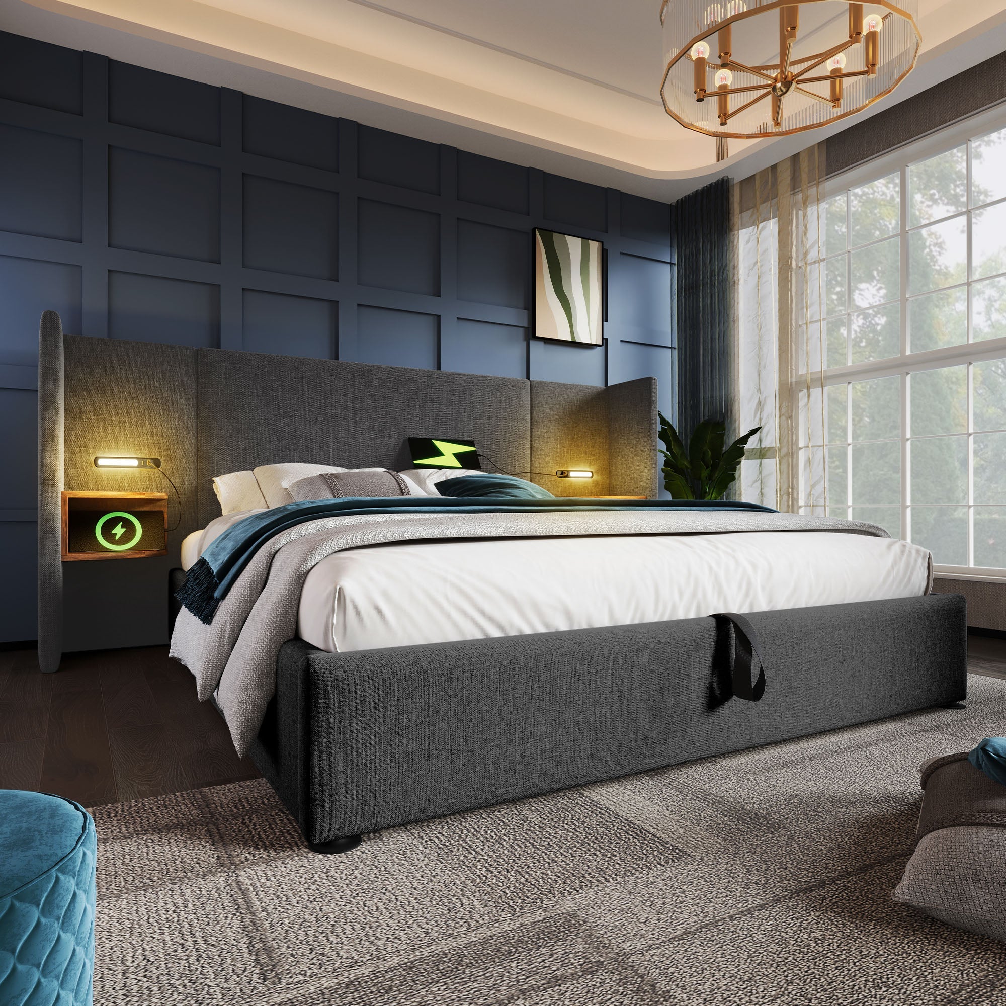 Upholstered Double Bed 180x200 with Bedside Table, Reading Lamp, USB-C Charging, Storage Frame, Solid Wood & Metal, Gray Linen