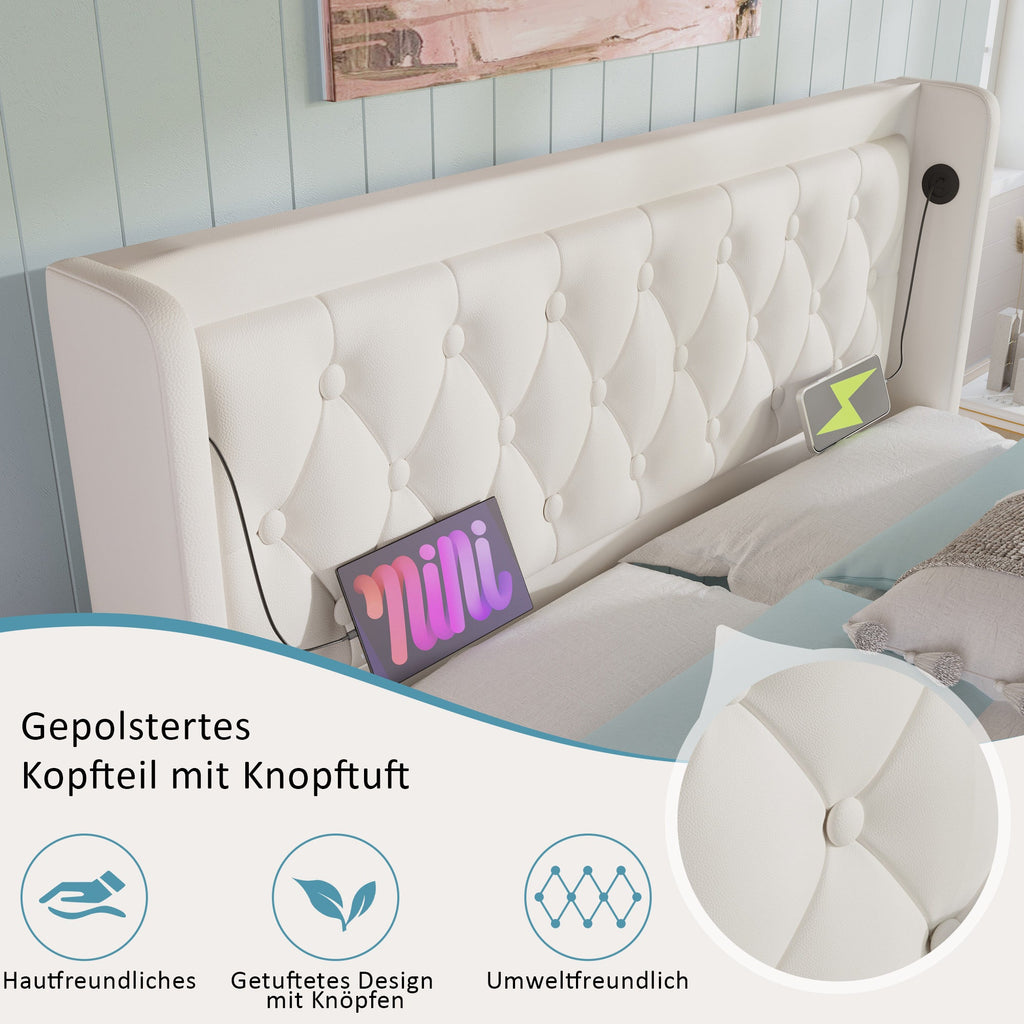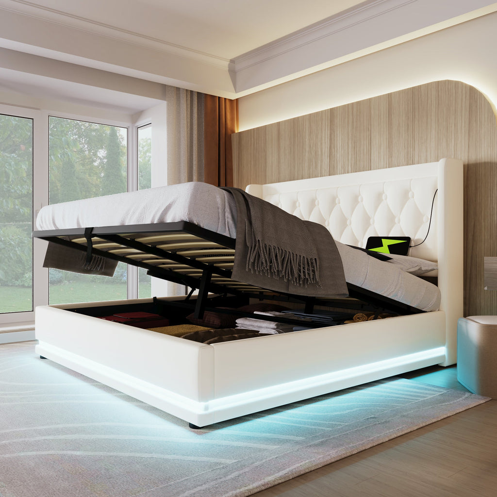 Upholstered Double Bed, Hydraulic Storage, USB-C, LED, White PU