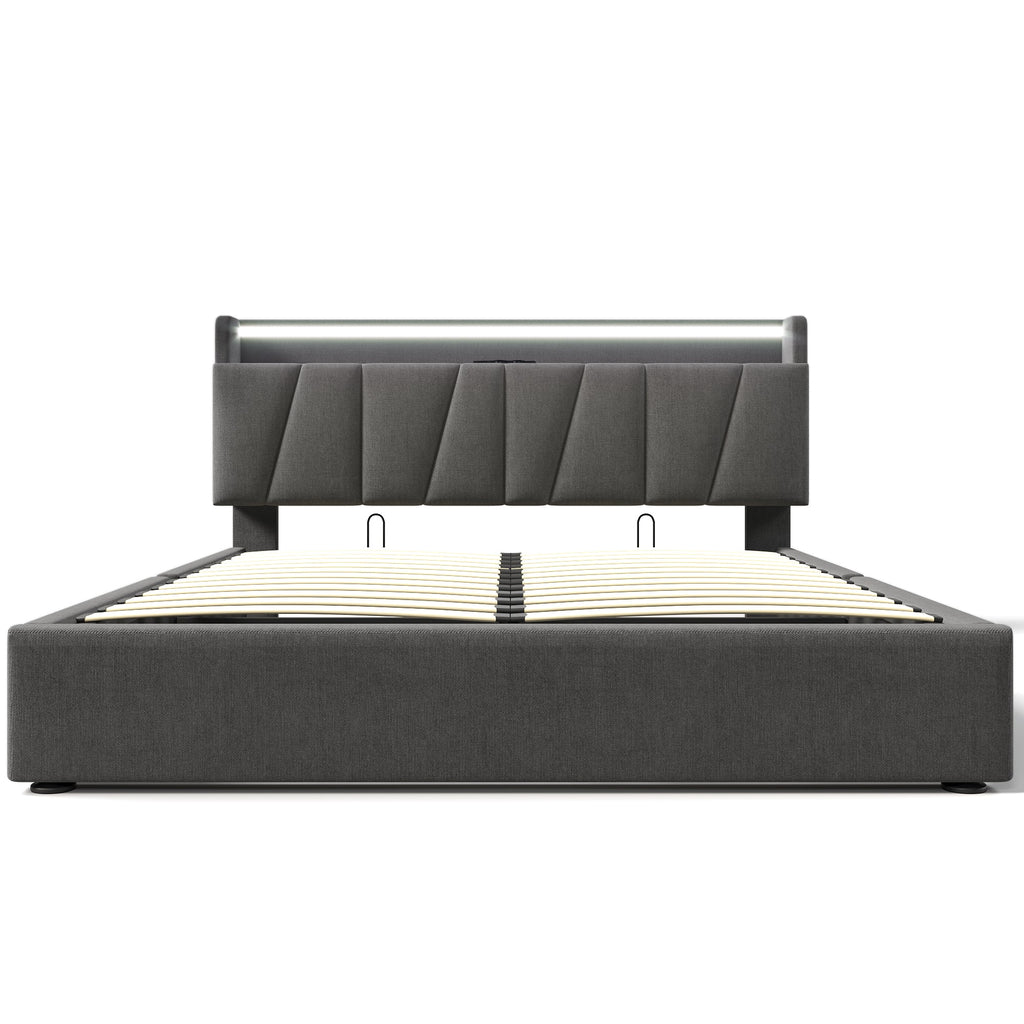 Upholstered Double Bed, USB Charging & LED Storage Headboard, 140x200cm, Gray