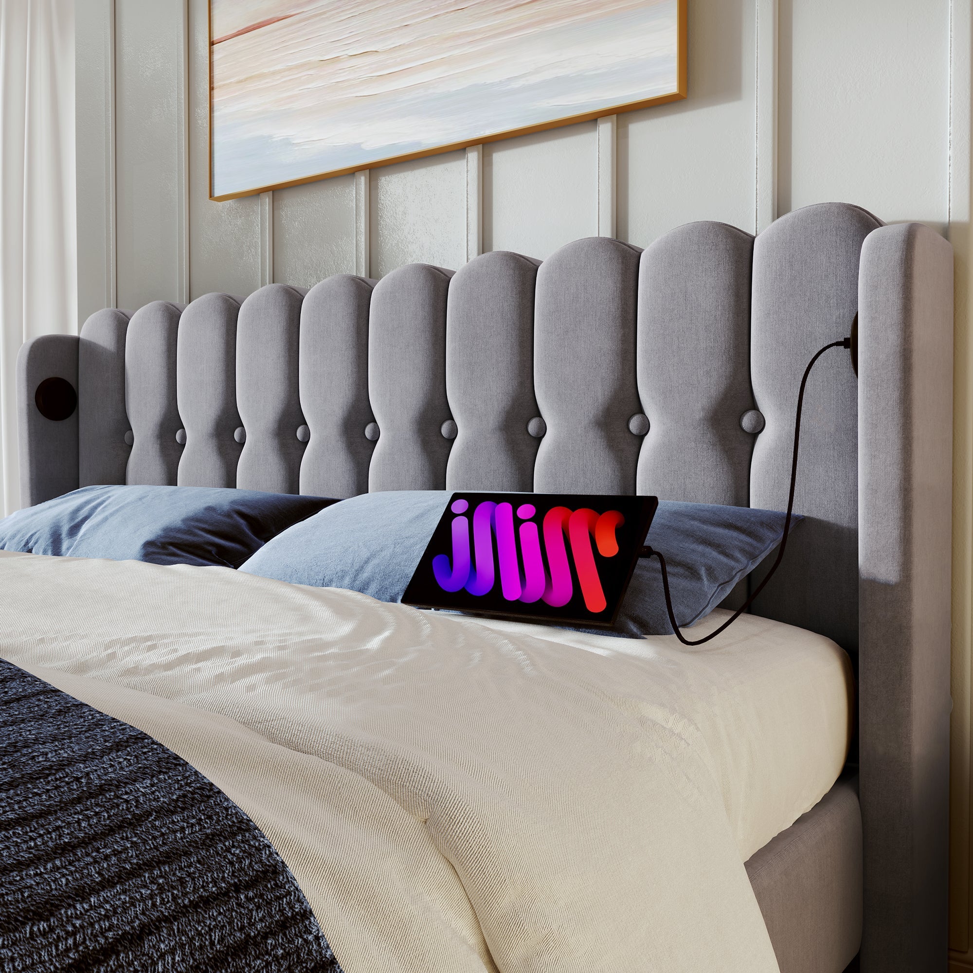 Upholstered Double Bed with USB Type C, Slatted Frame, 160 x 200 cm, Gray Linen