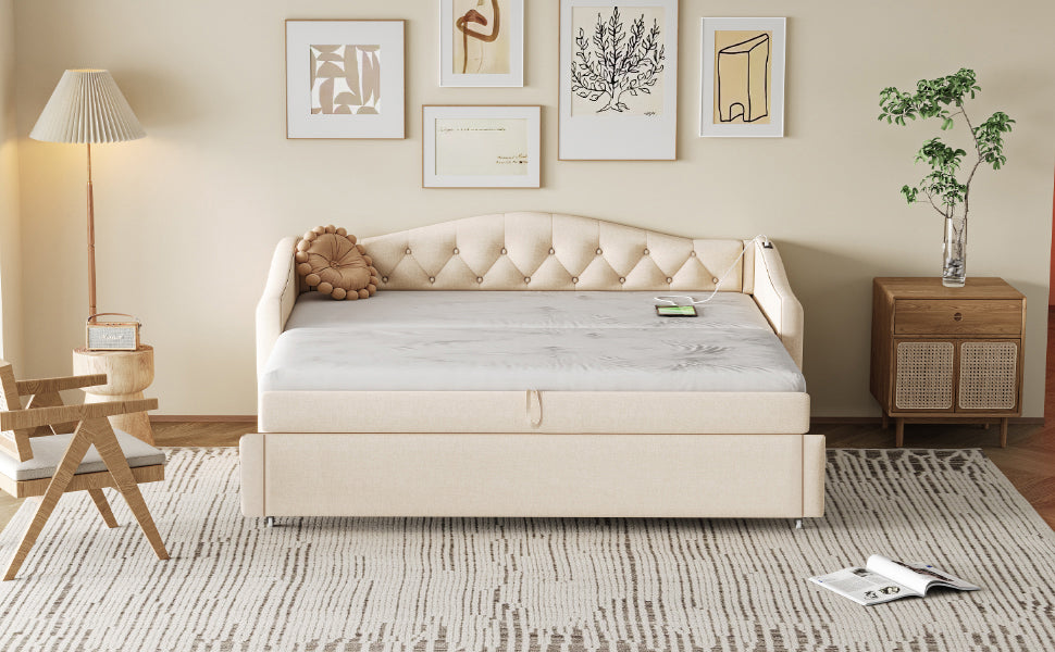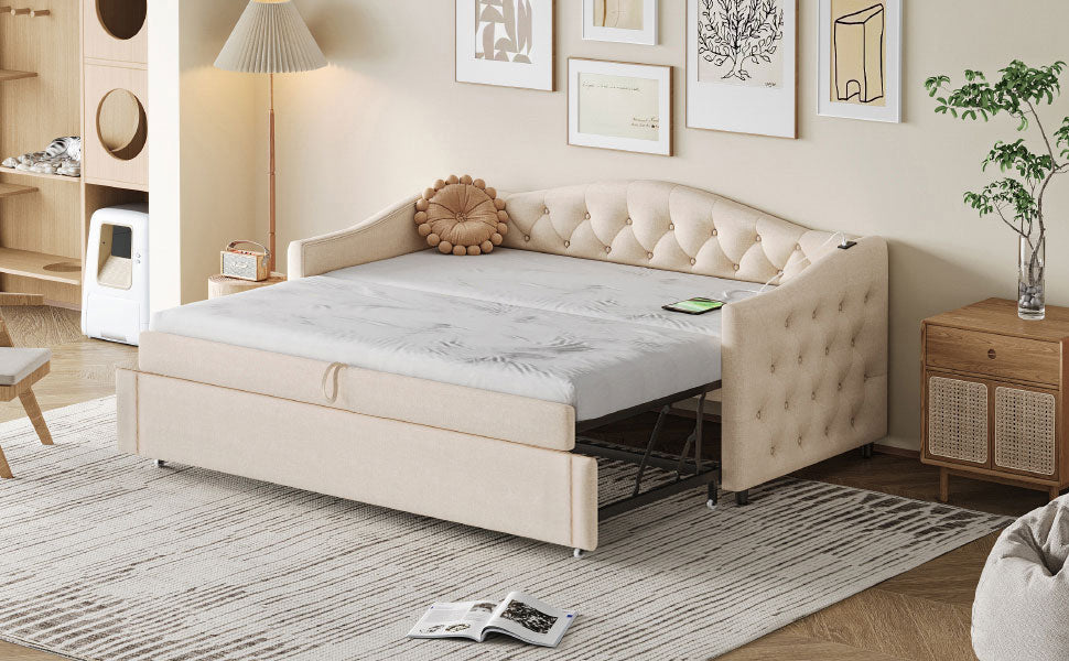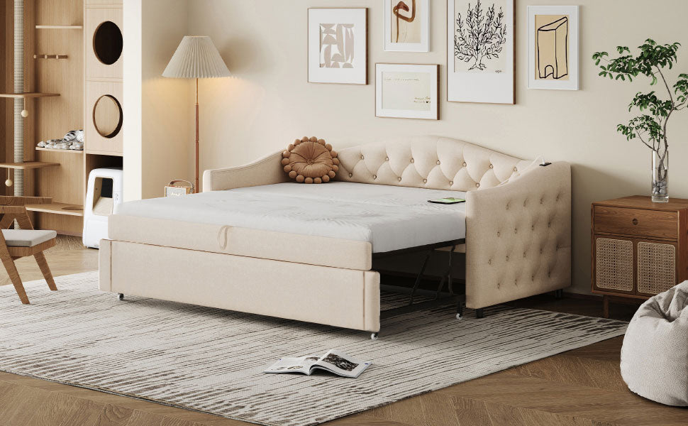 Upholstered Pull-out Sofa Bed with USB Port, Slatted Frame, Multifunctional - Linen Fabric, Beige