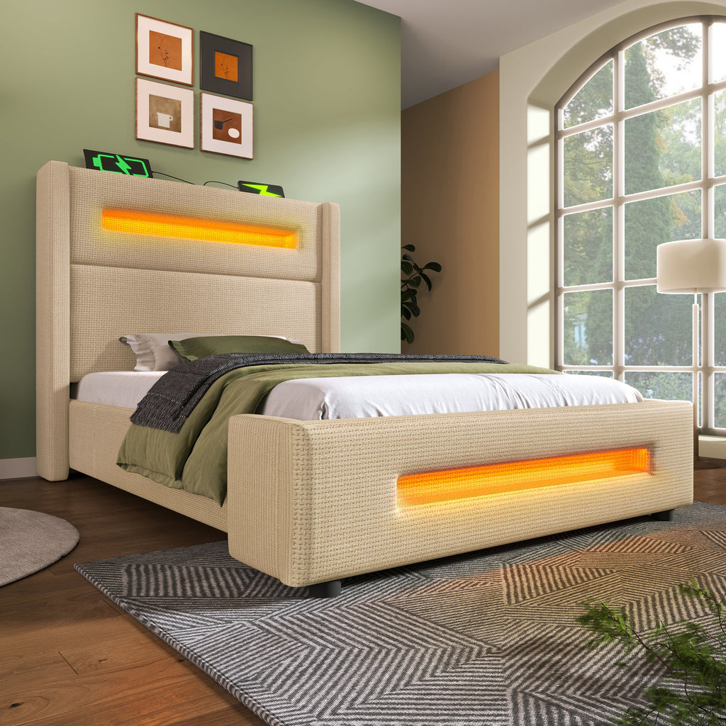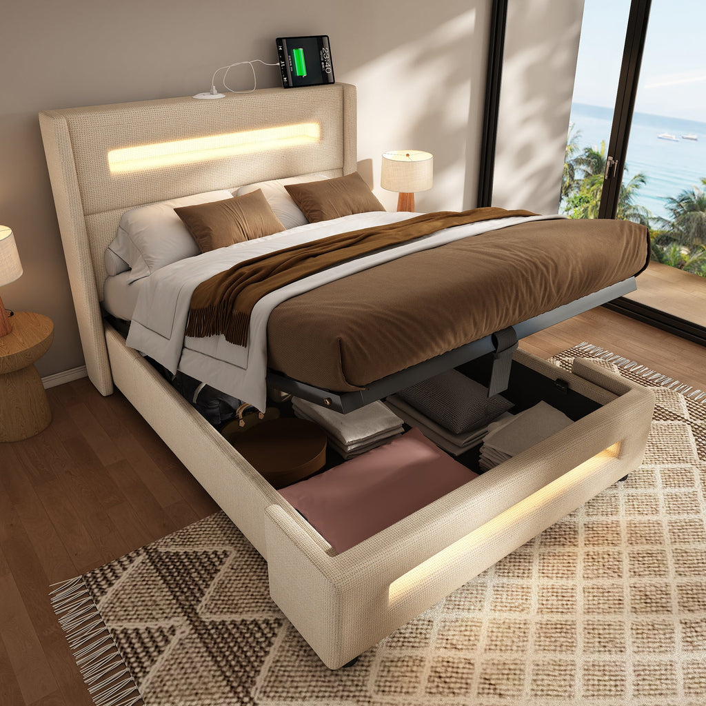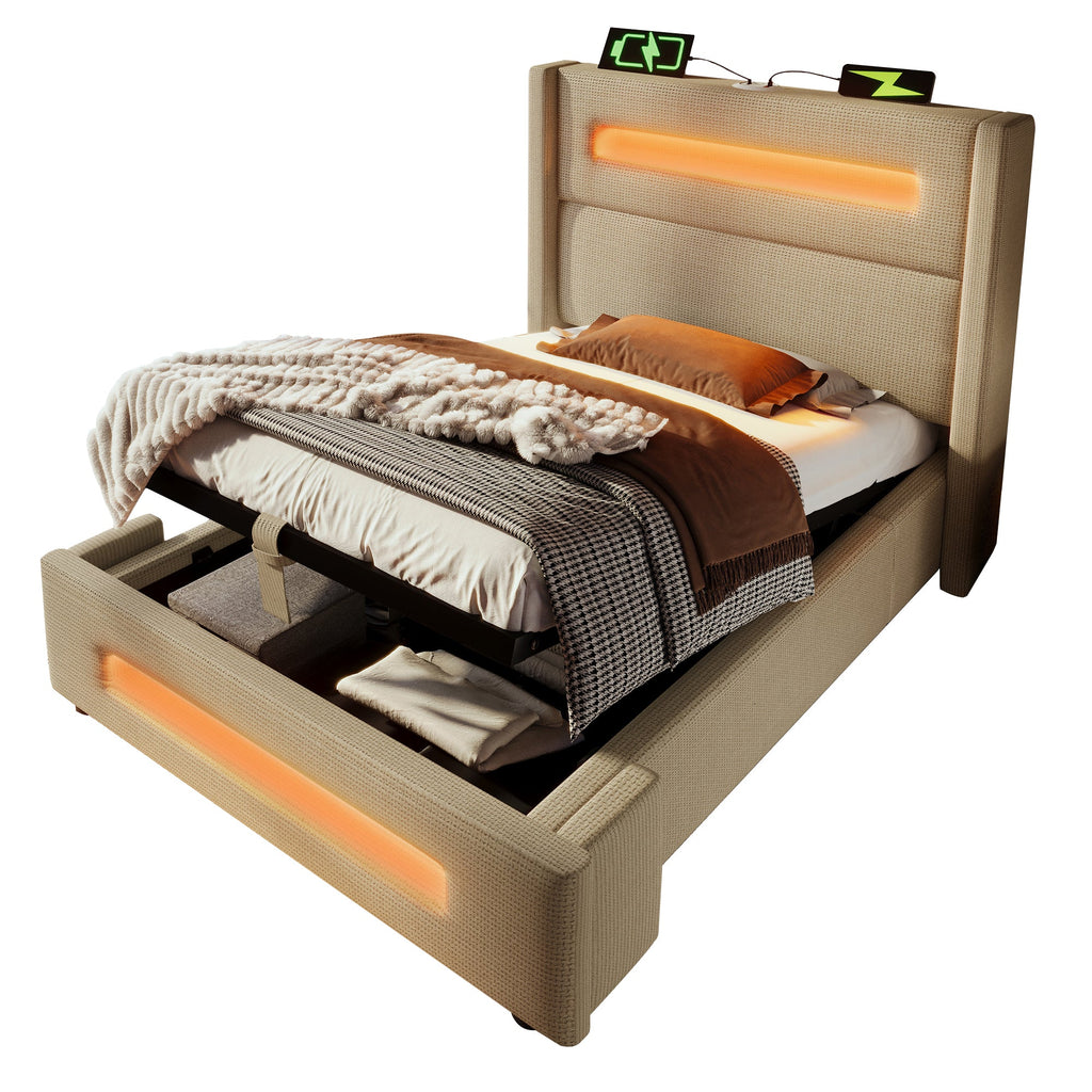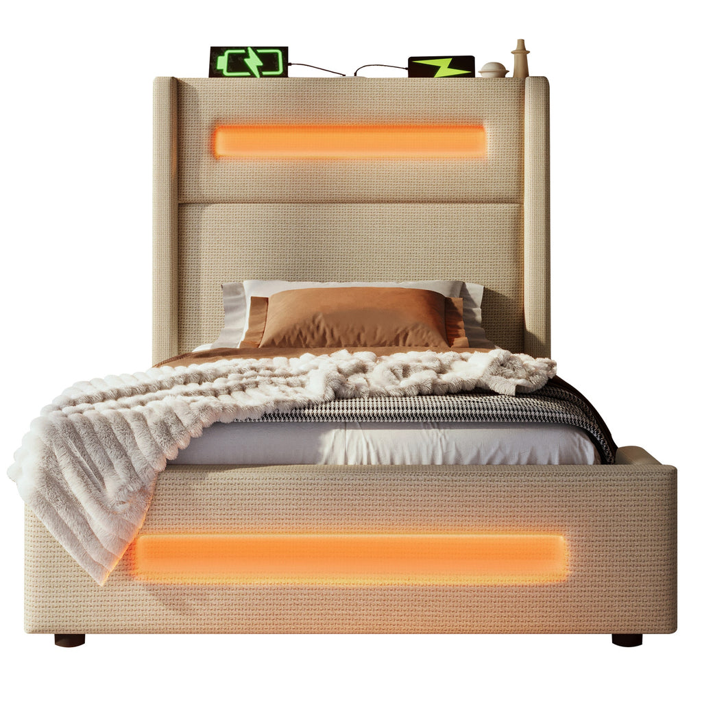 Upholstered Single Bed, 90x200 cm with LED & Hydraulic Storage, Beige Linen