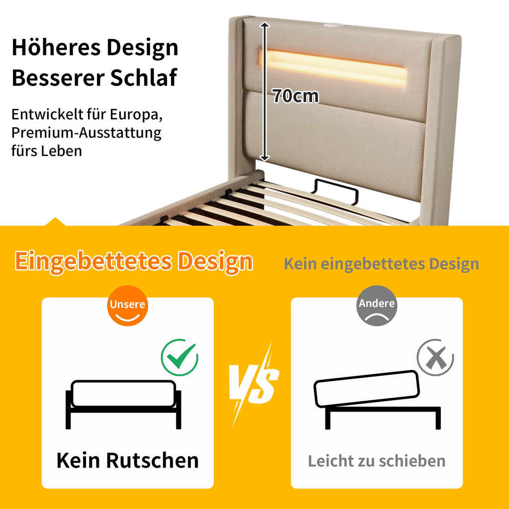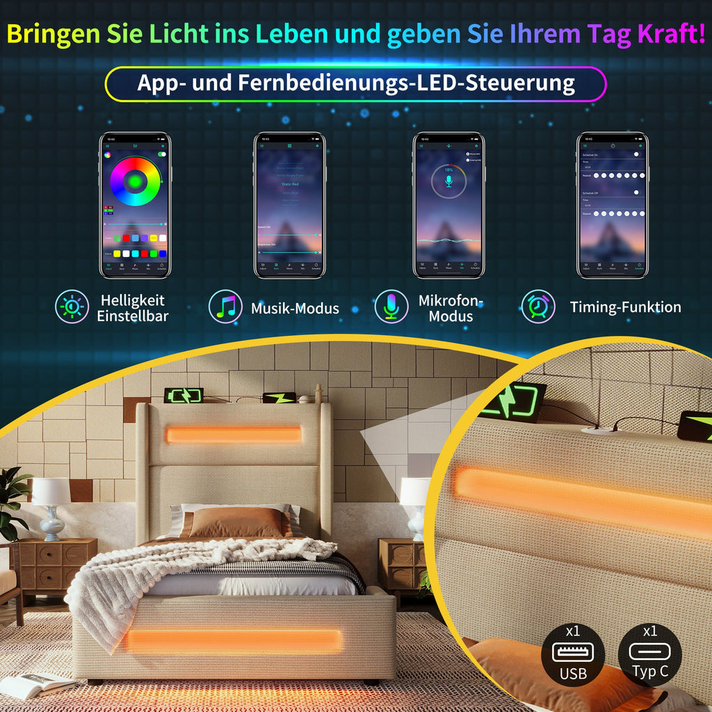 Upholstered Single Bed, 90x200cm LED Hydraulic Storage, Metal Frame, Beige Linen